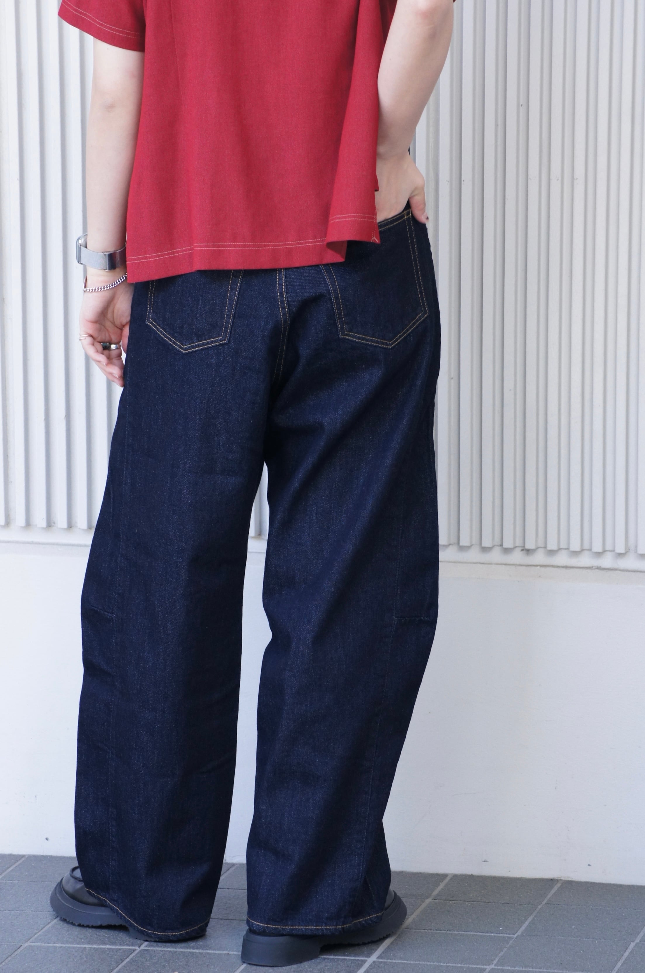 パネルのように縫製された立体感のあるシルエットが特徴のワイドジーンズ。
