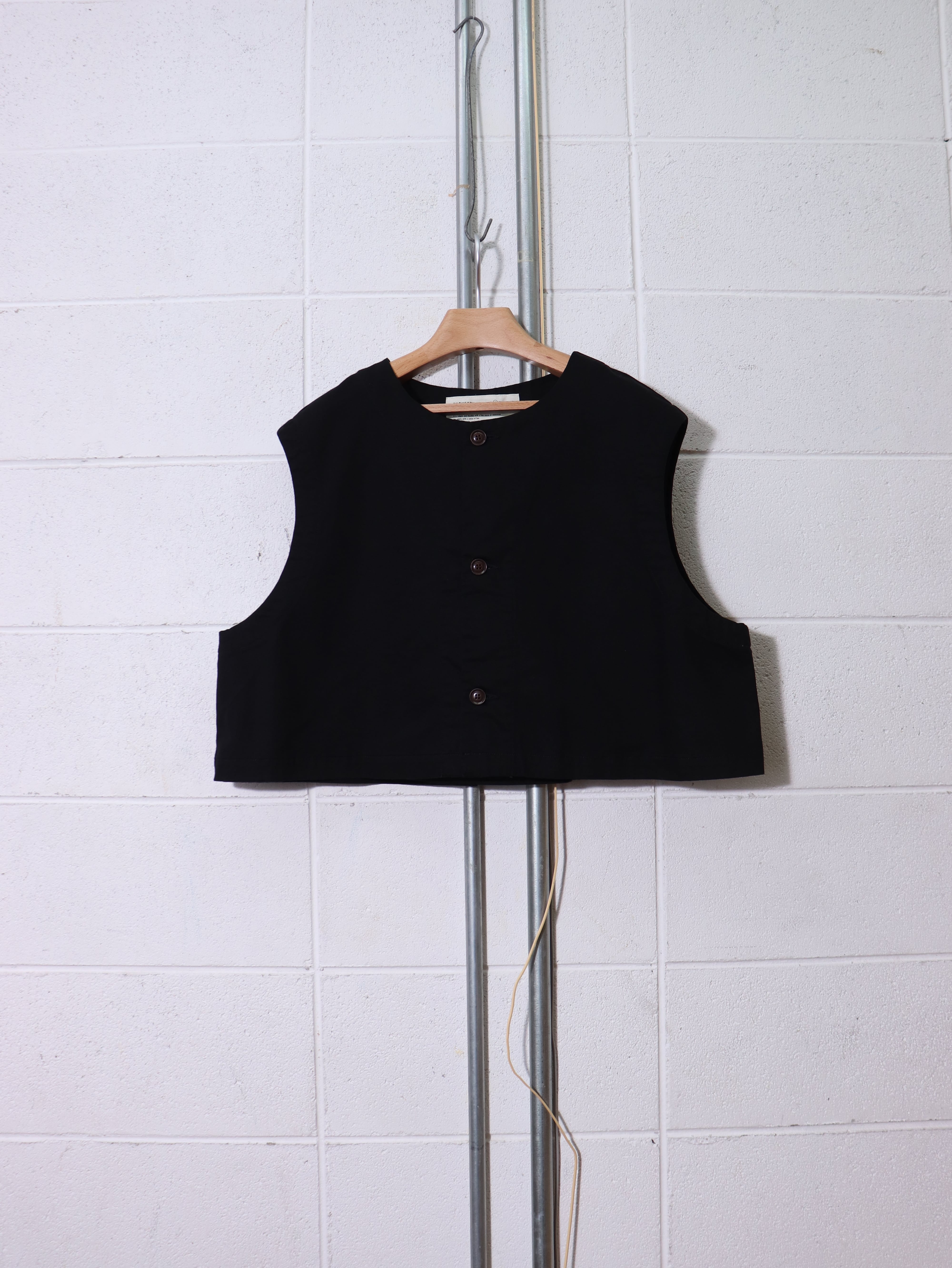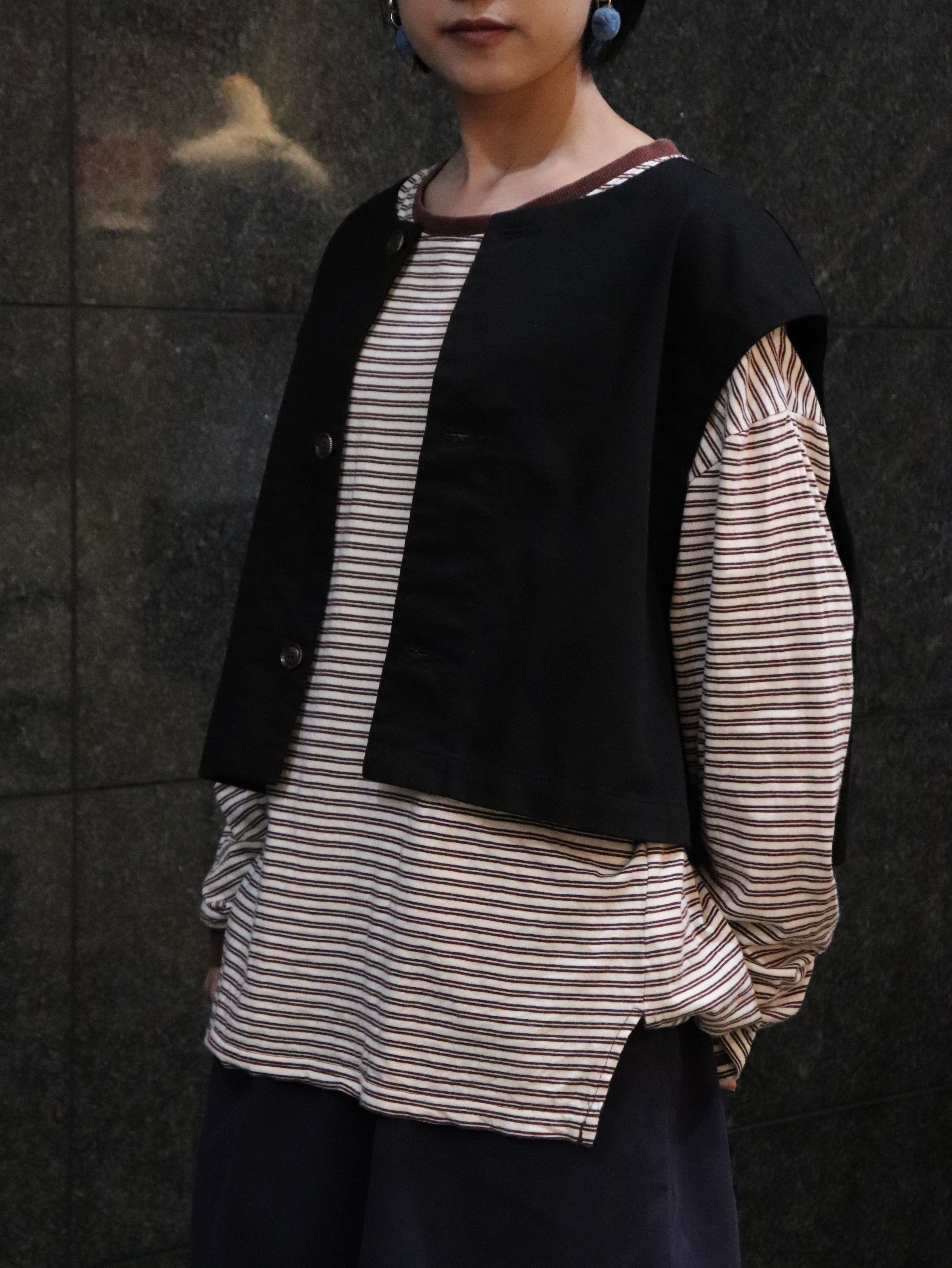 シンプルでミニマルなデザインながら、短めの着丈とすっきりとしたノーカラーデザインが、シャツやワンピースとのレイヤードに抜群の相性を発揮します。同素材のチノアトリエジャケットと組み合わせれば、奥行きのあるスタイリングも楽しめます。