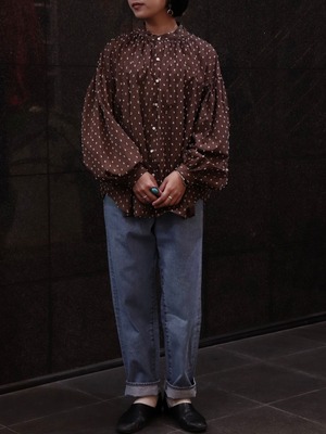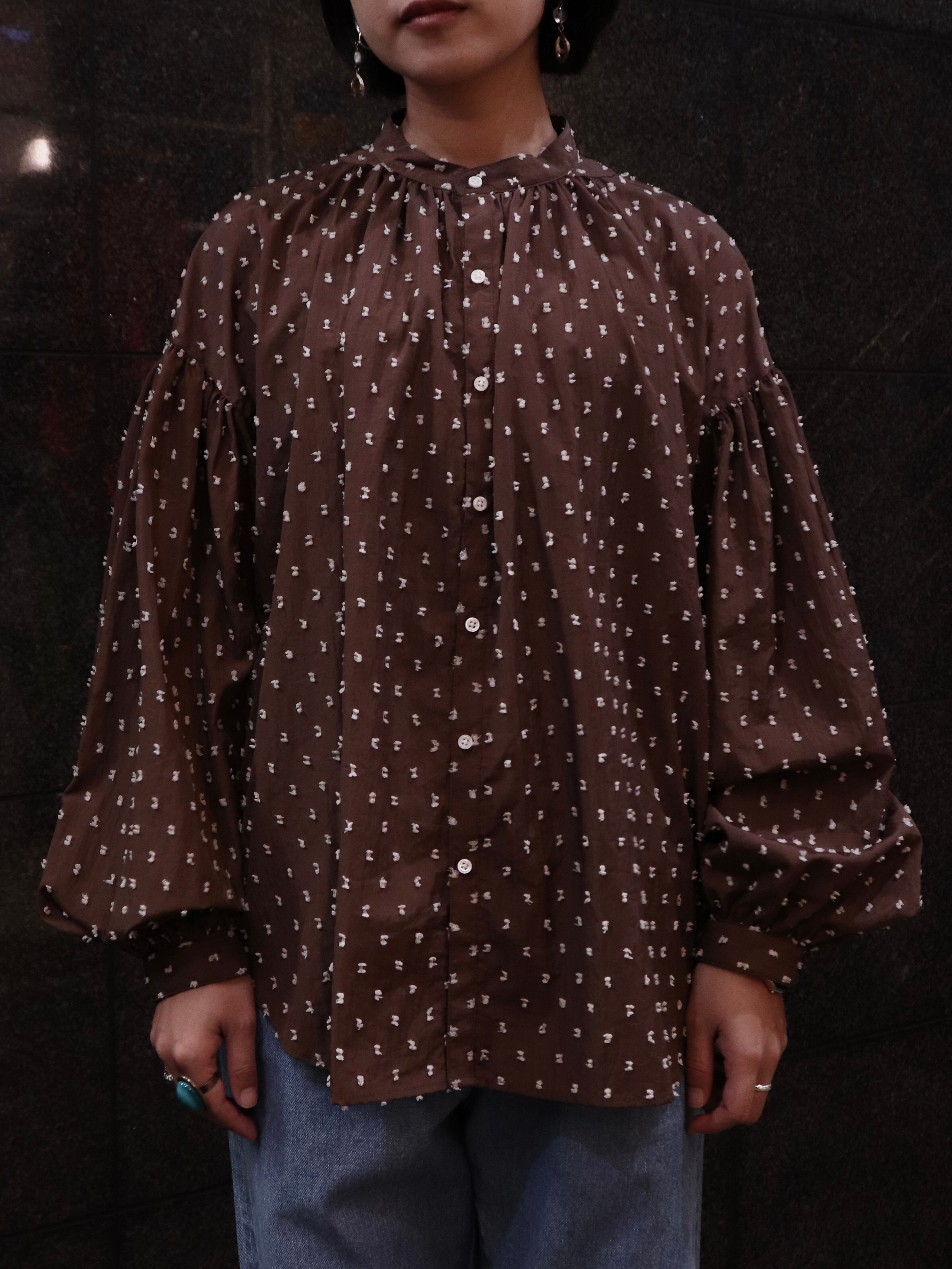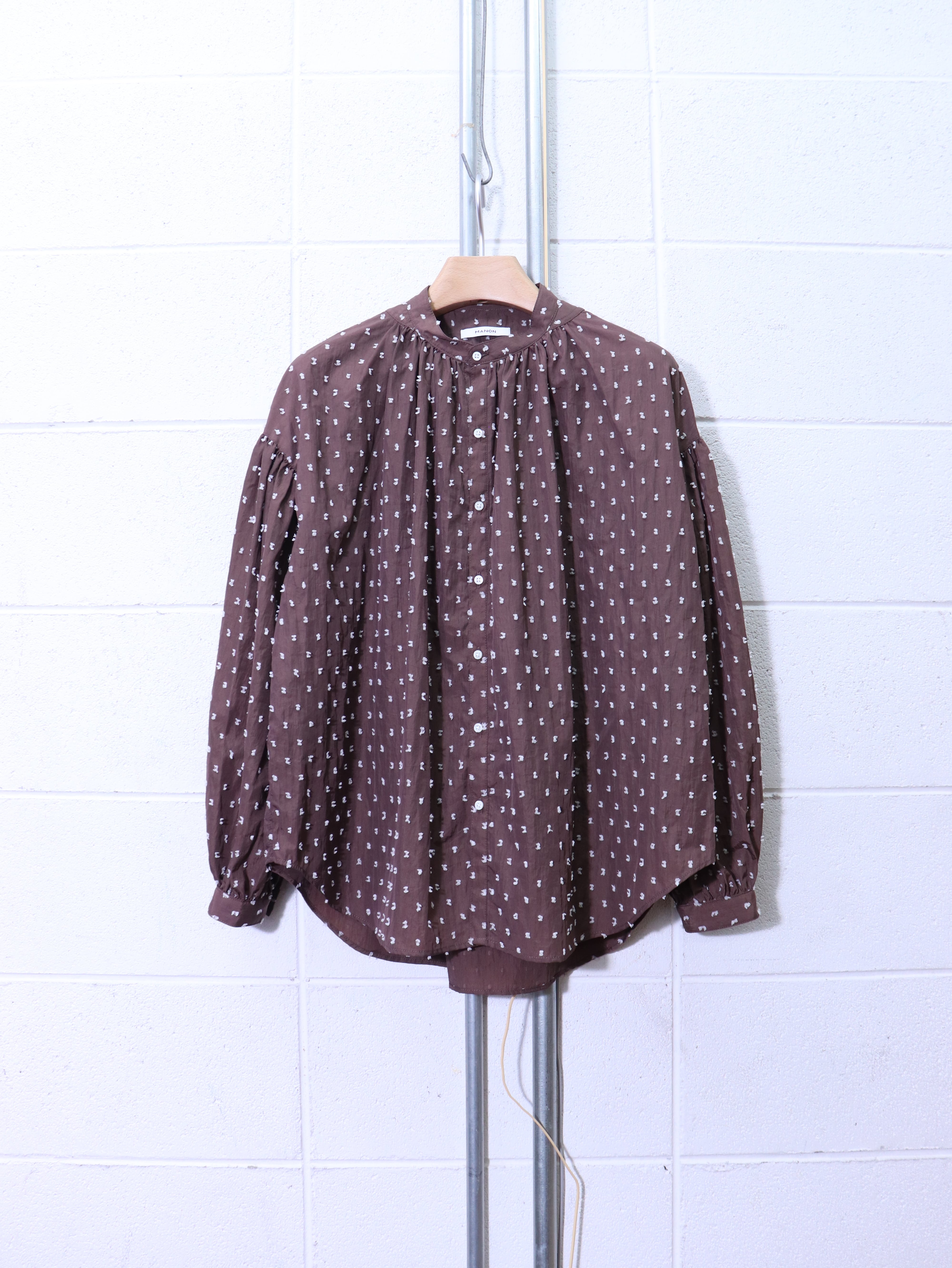 襟元はすっきりとしたバンドカラー、肩を落とし、襟周りから後ヨーク、袖口にかけてたっぷりとギャザーを寄せることで、ふんわりとした立体感のあるMANONの定番シャツです。
