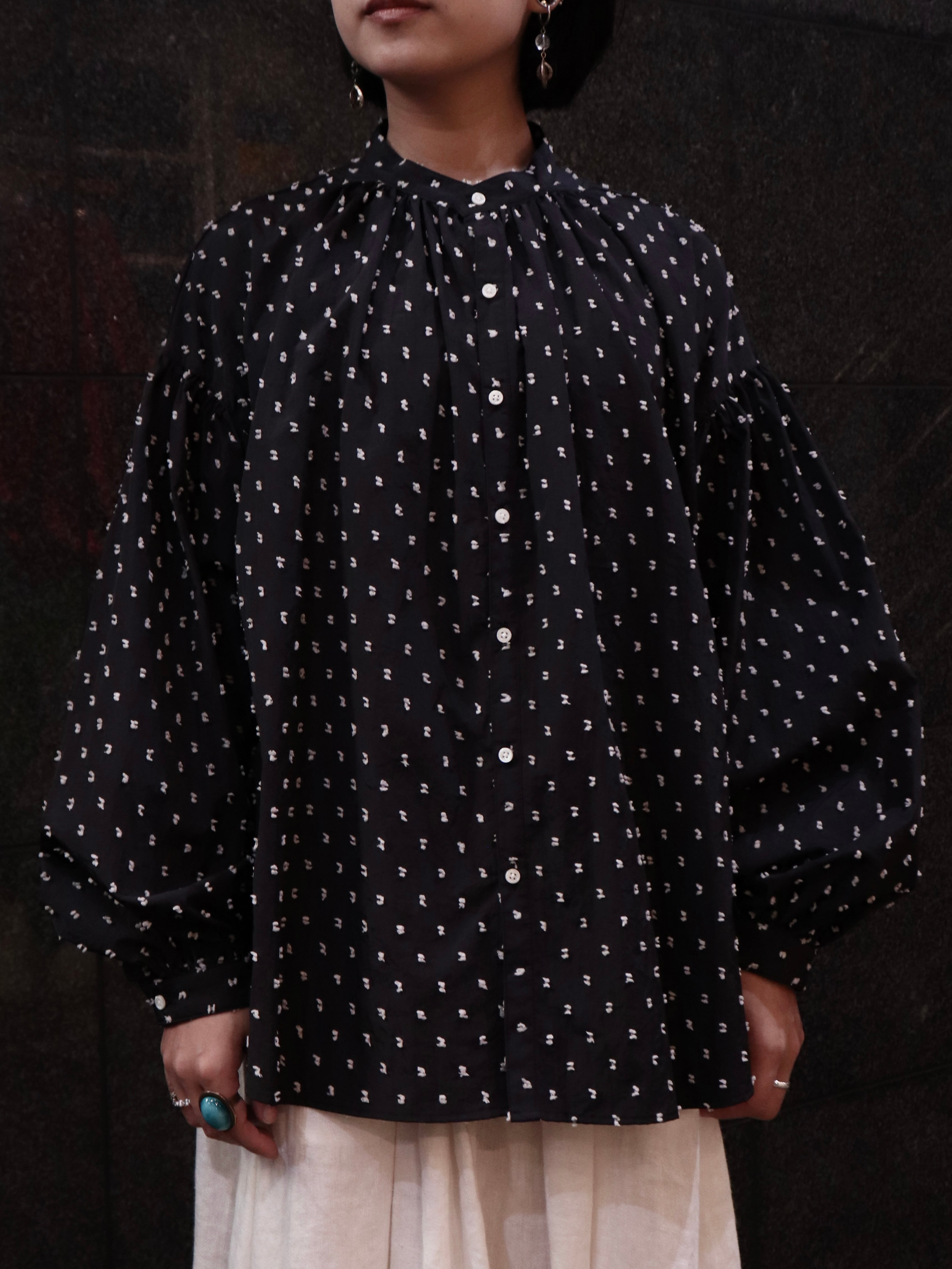 襟元はすっきりとしたバンドカラー、肩を落とし、襟周りから後ヨーク、袖口にかけてたっぷりとギャザーを寄せることで、ふんわりとした立体感のあるMANONの定番シャツです。