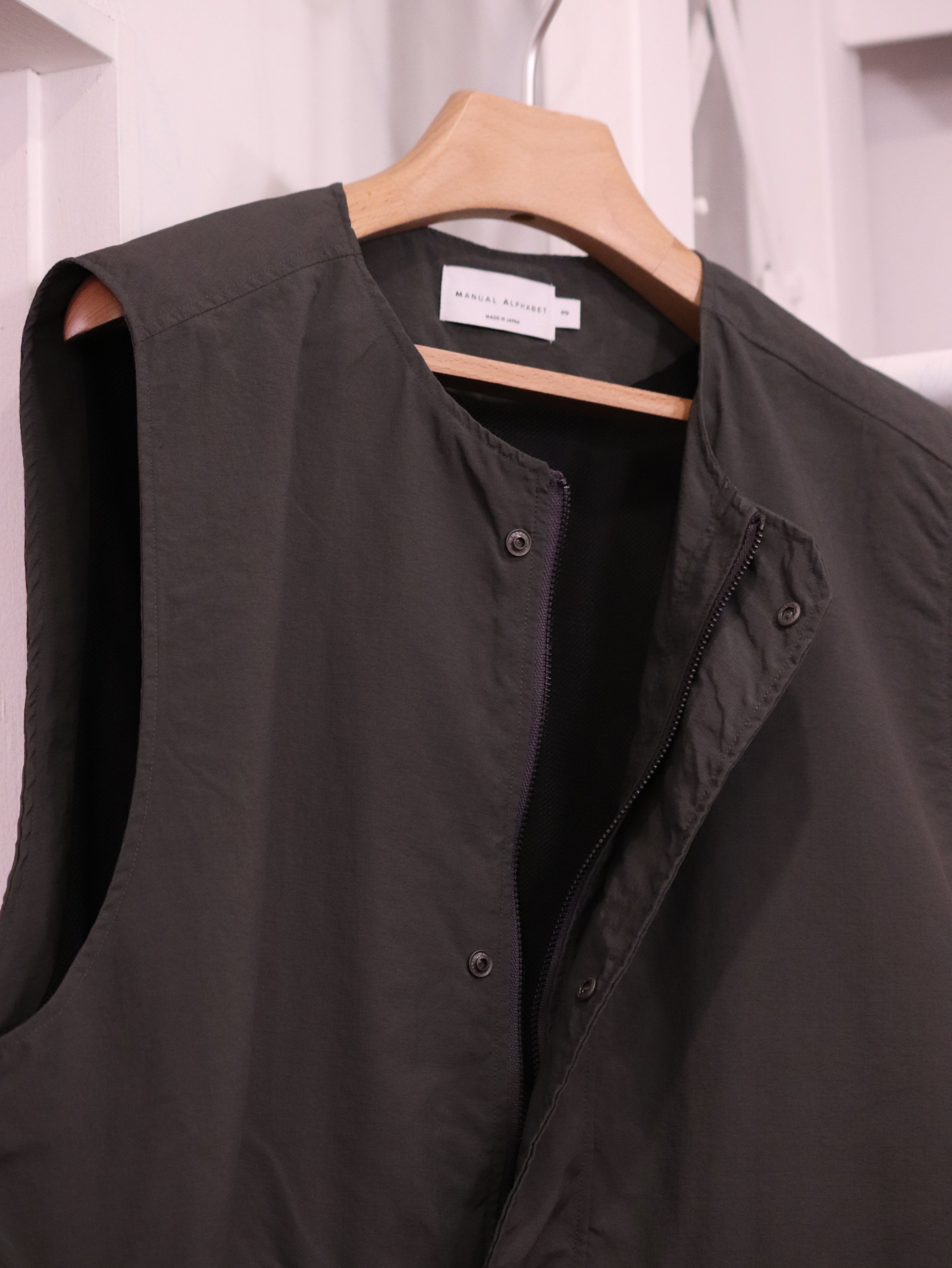 ミリタリージャケットのディテールから着想を得たデザインで、フロントはファスナーを隠しドット釦の前立て仕立て。ポケットは切替のシームに合わせ、ミニマルなデザインに仕上げました。
