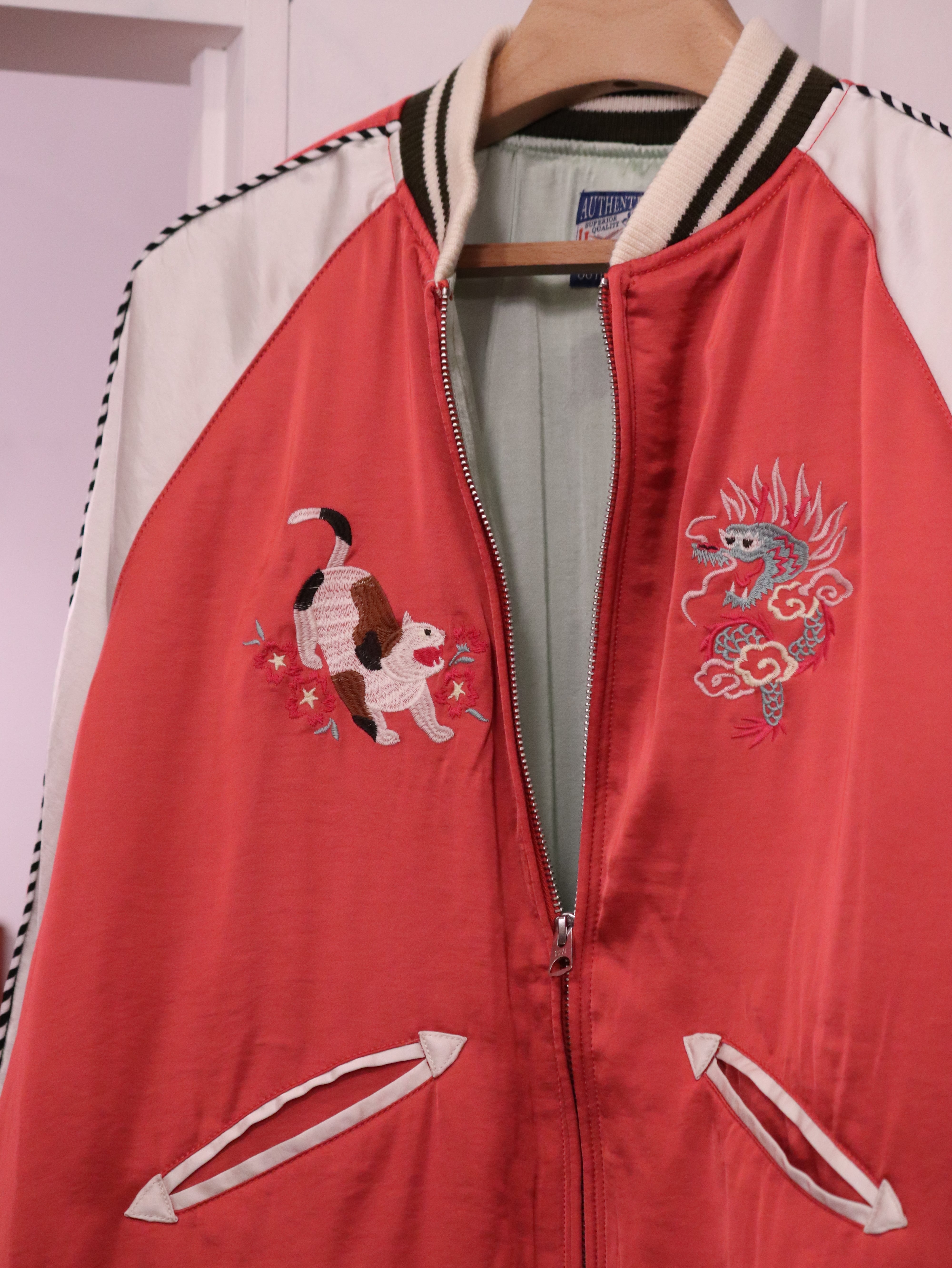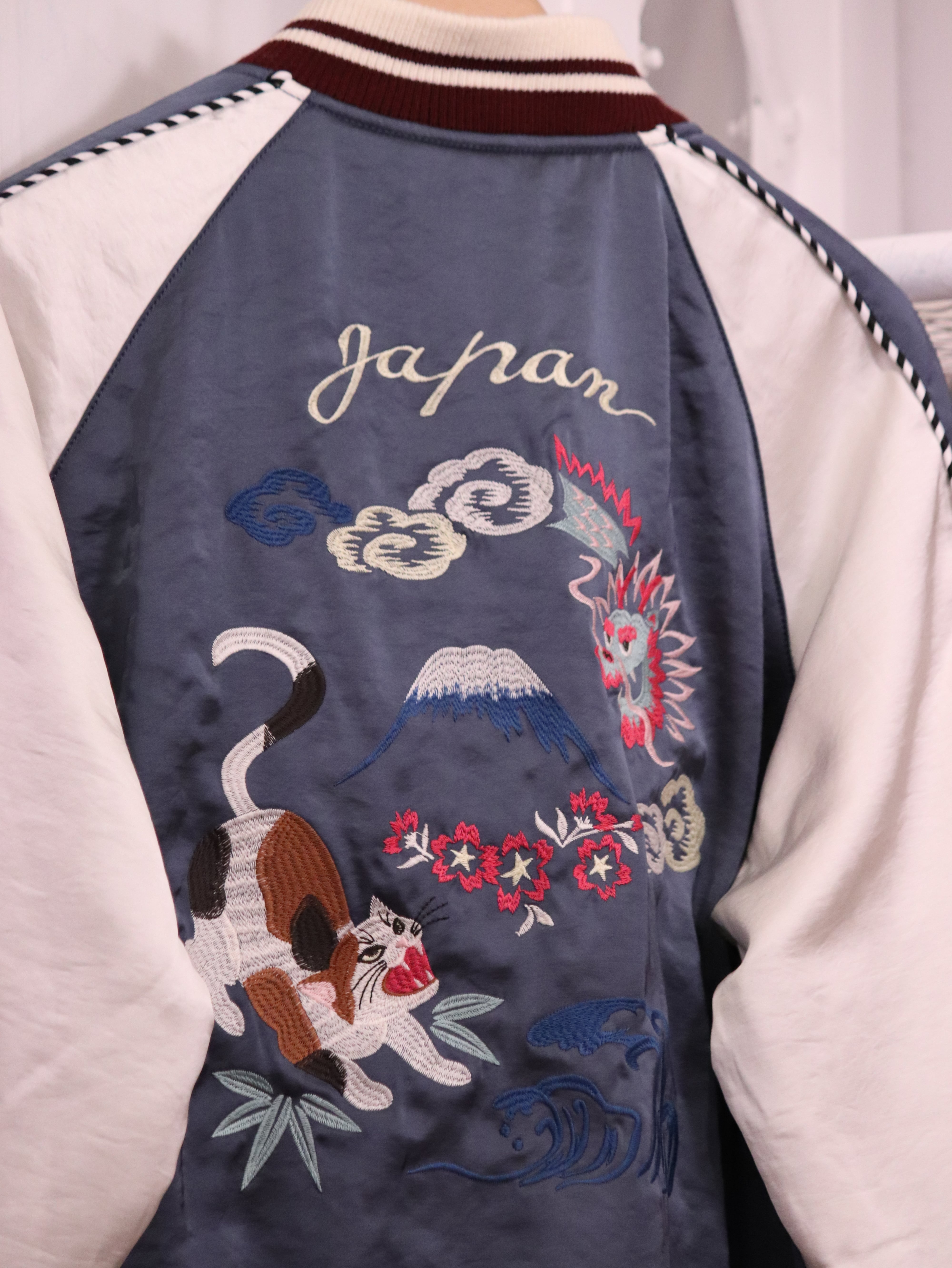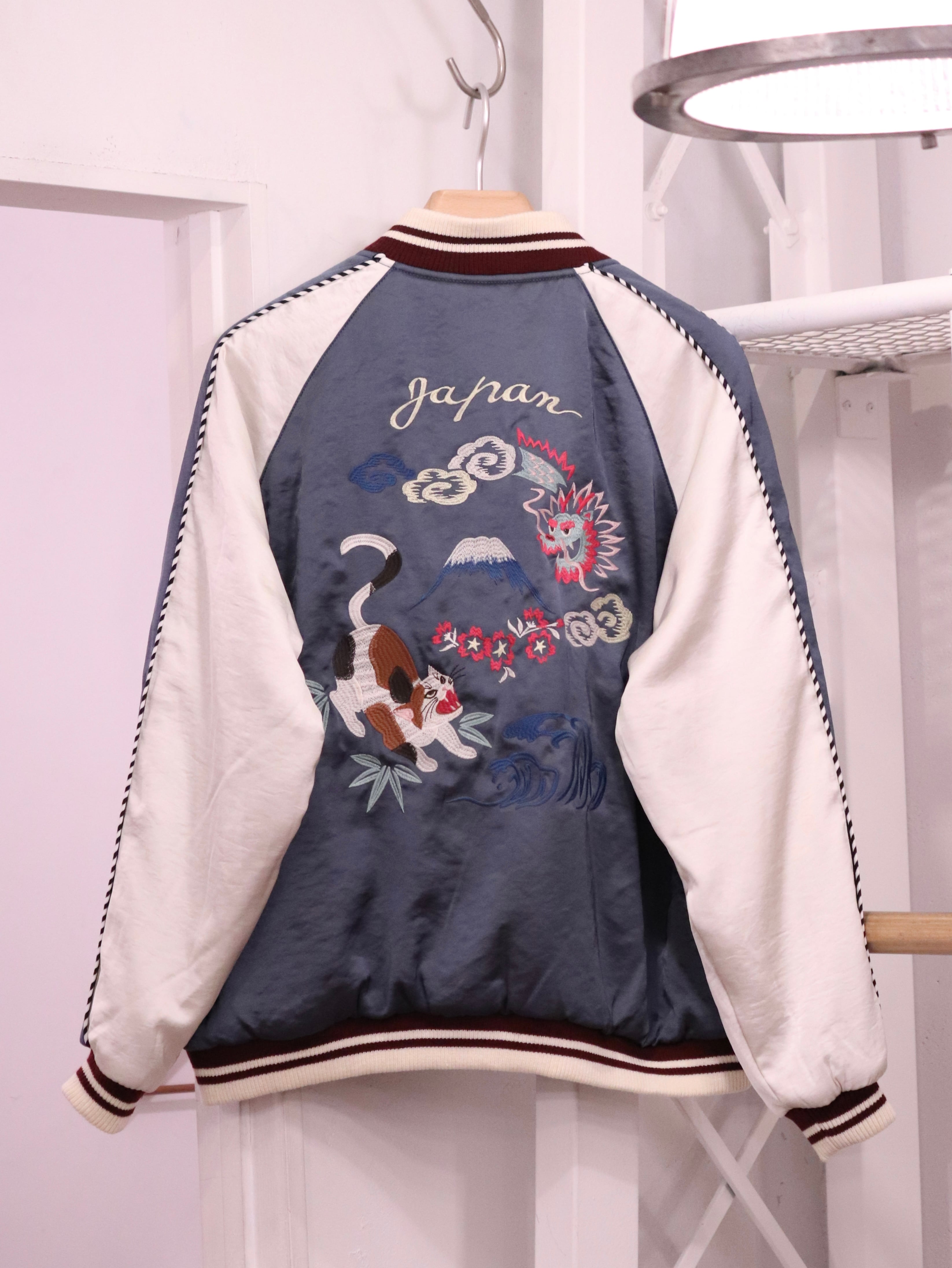 和テイストを取り入れつつ、スカジャンの定番の龍と可愛らしい猫を組み合わせた柄をデザイン。程よくコンパクトなシルエットでスカートなどボリュームのあるボトムスとも合わせやすいので女性にもおすすめの着やすいスカジャンです。