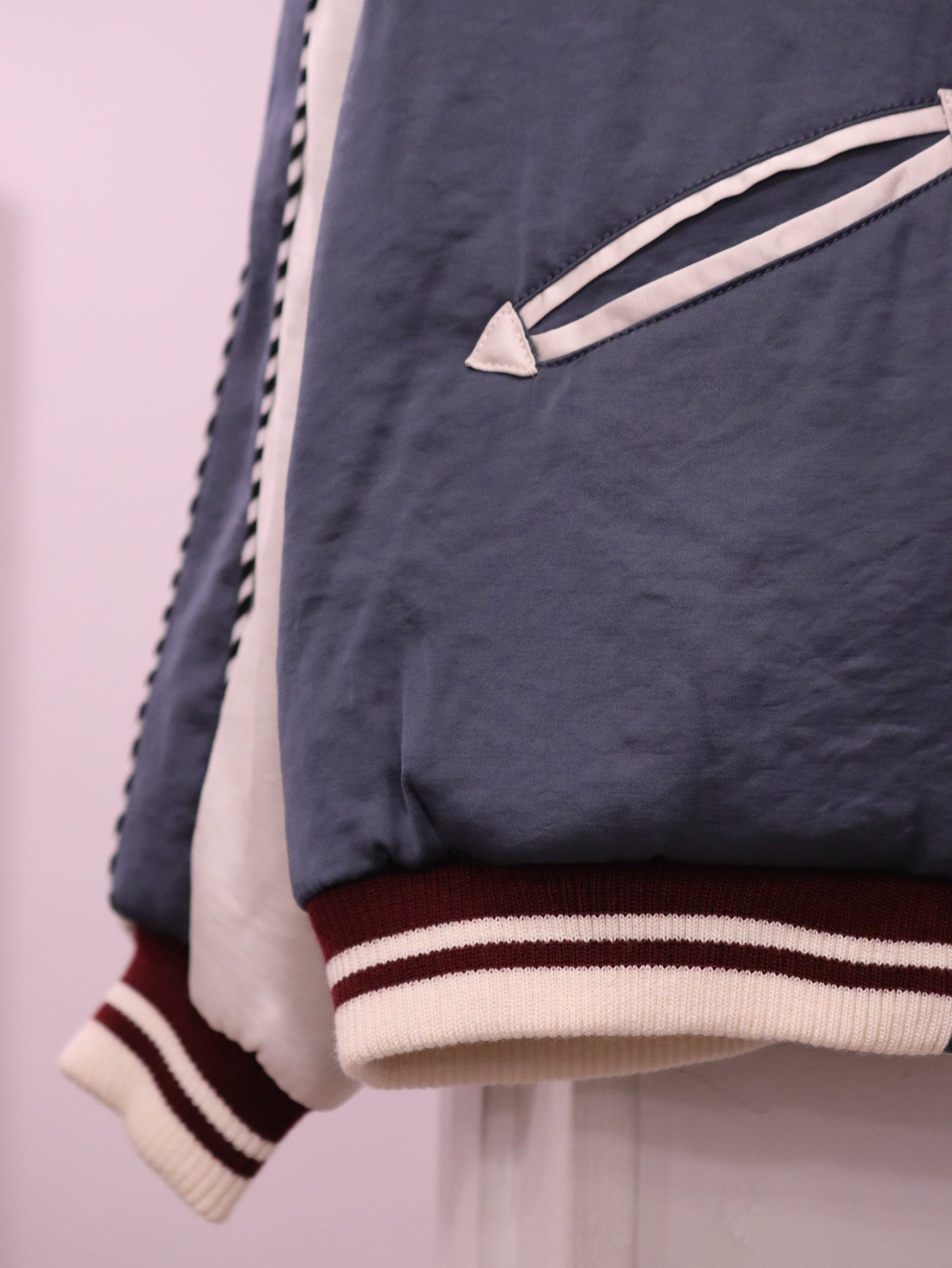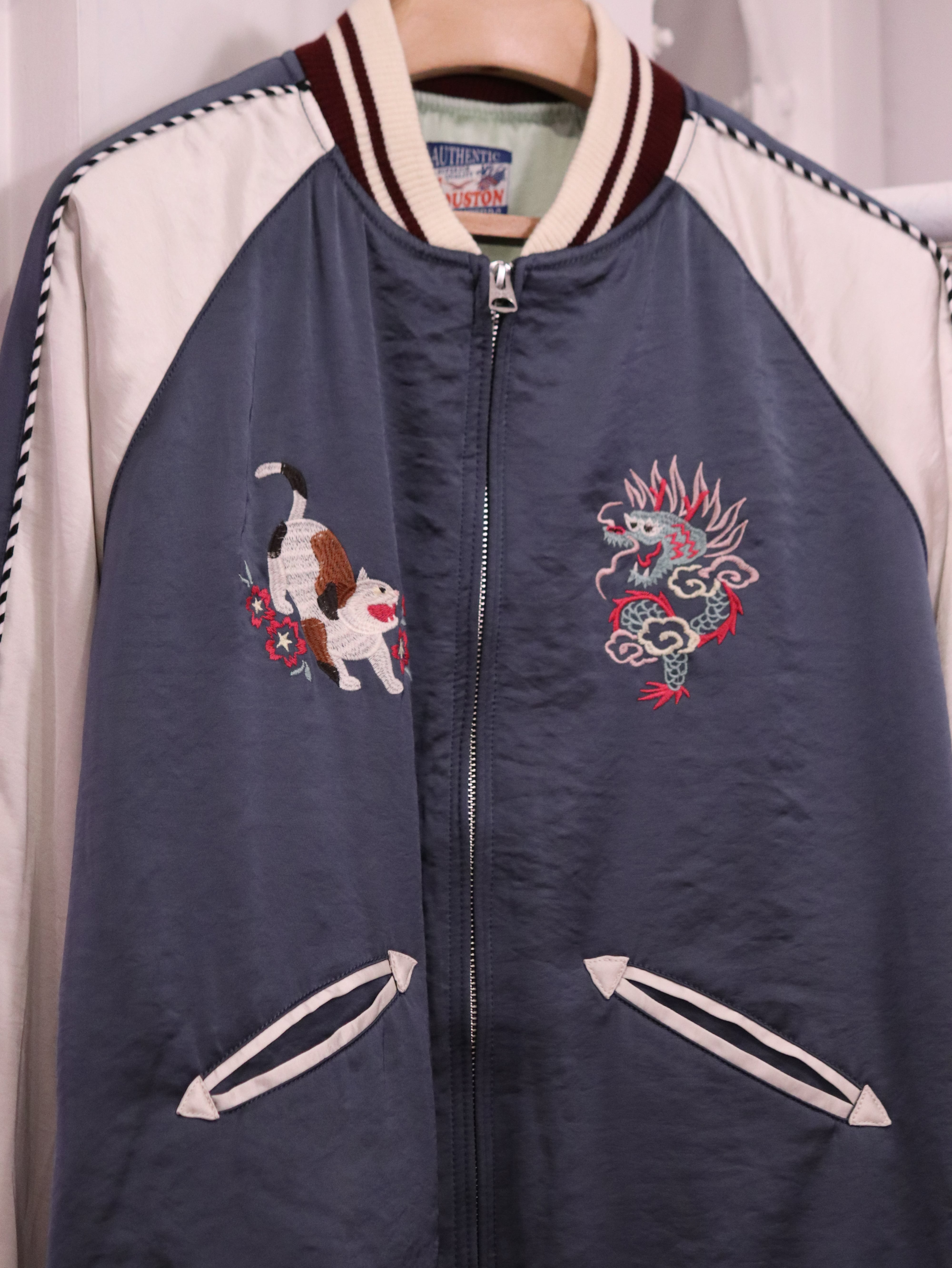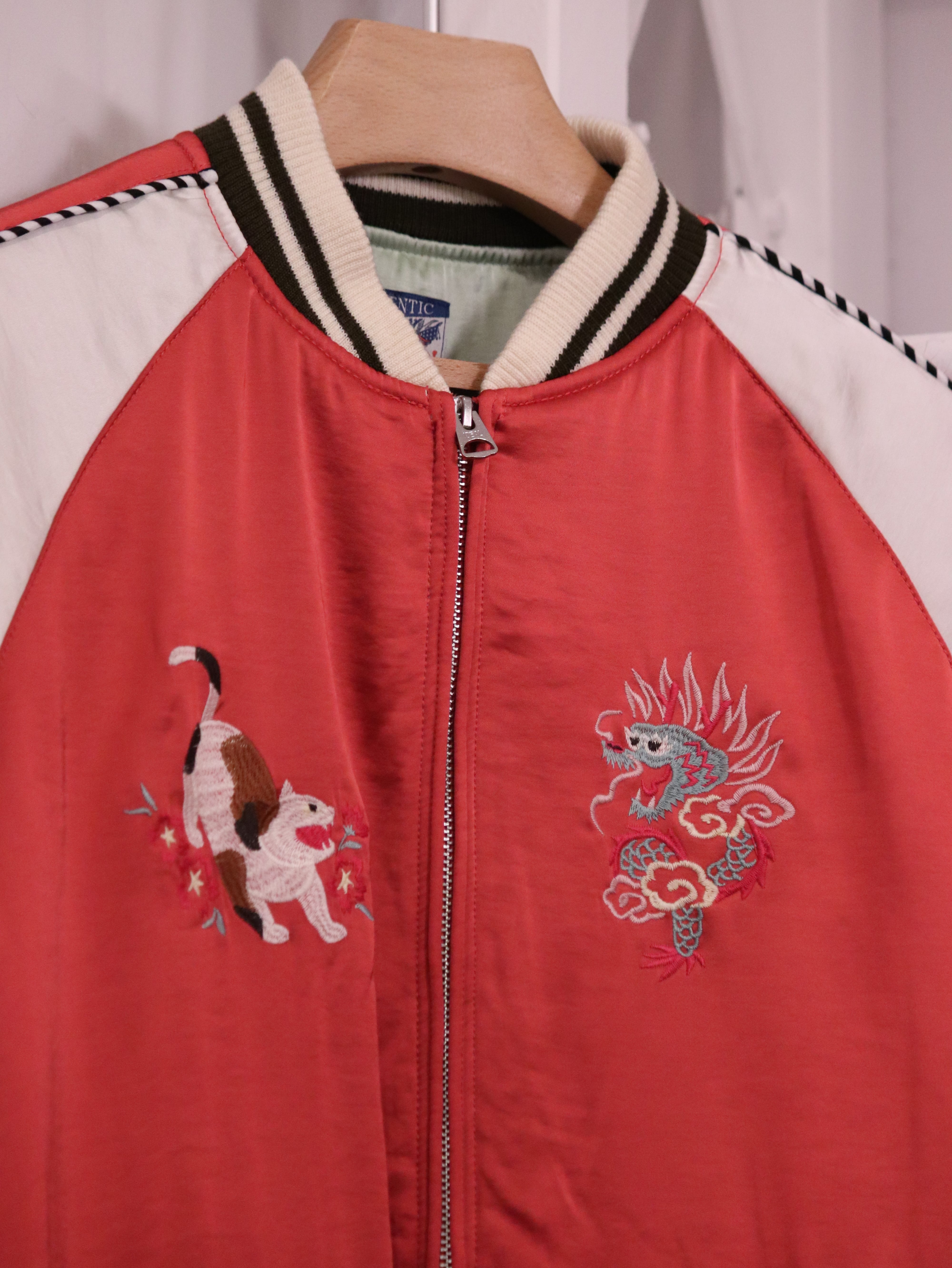 和テイストを取り入れつつ、スカジャンの定番の龍と可愛らしい猫を組み合わせた柄をデザイン。程よくコンパクトなシルエットでスカートなどボリュームのあるボトムスとも合わせやすいので女性にもおすすめの着やすいスカジャンです。