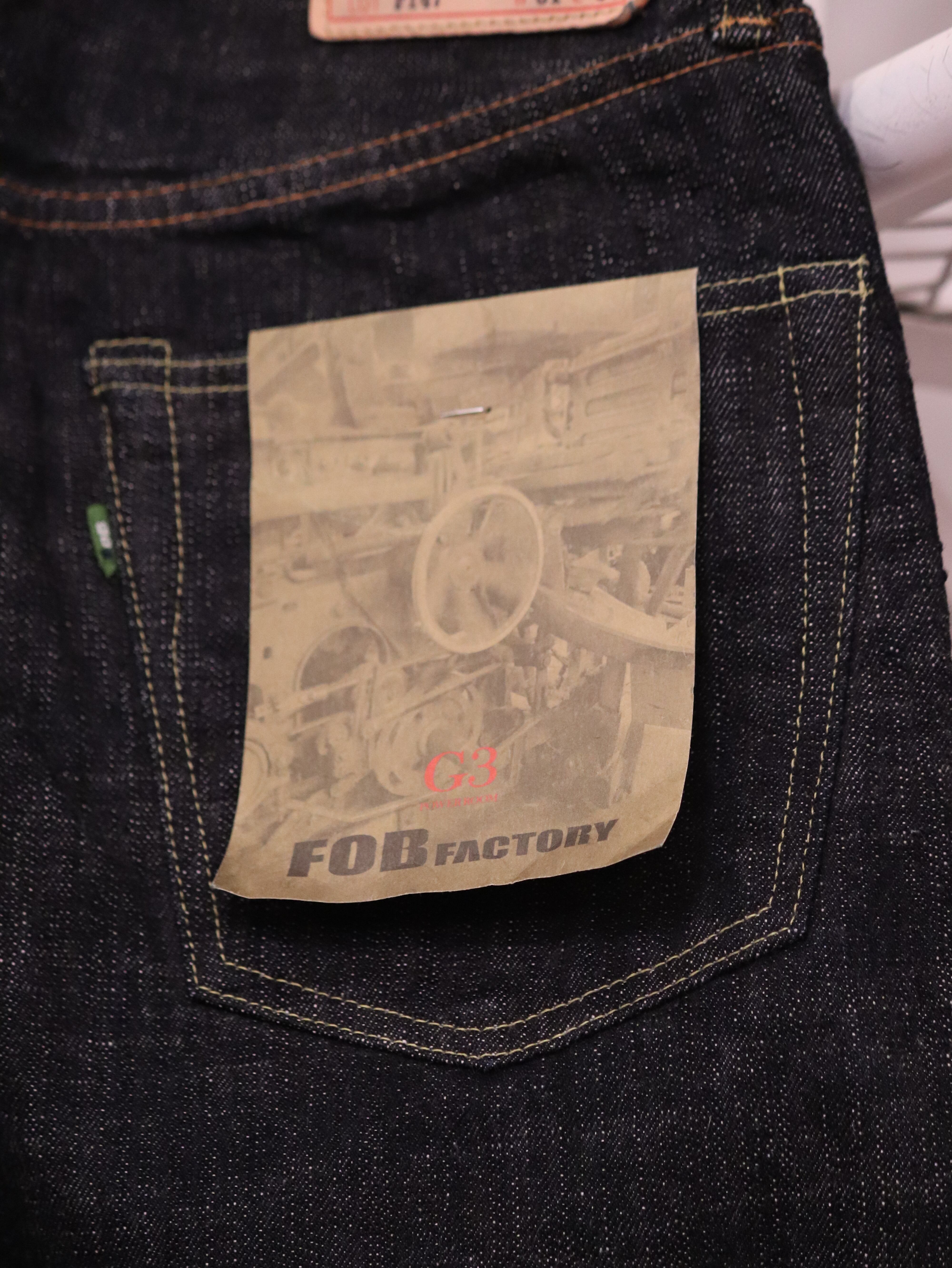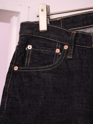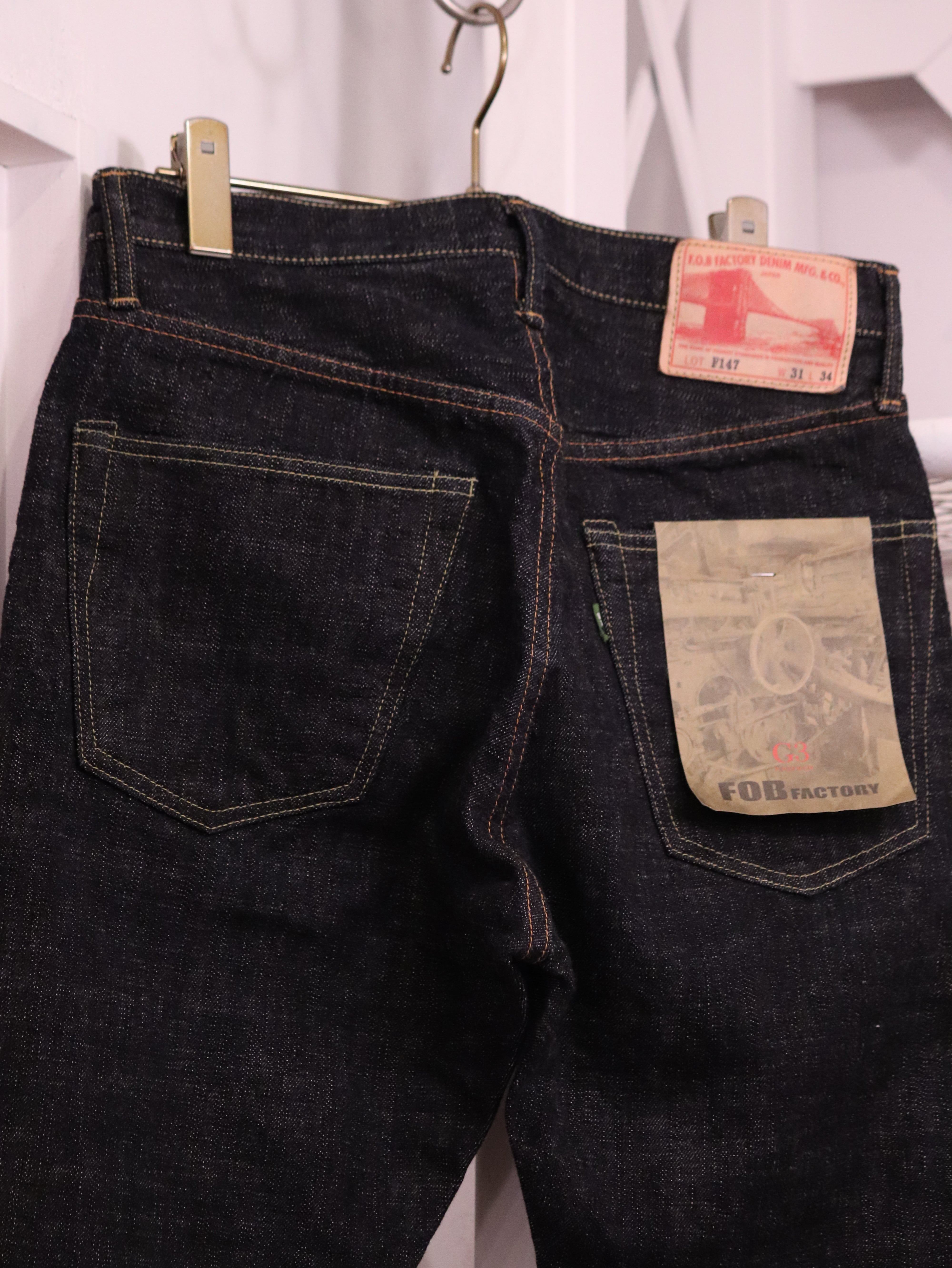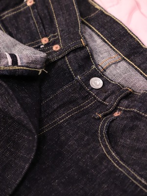 その他、ヴィンテージマニアも注目のディテール、MADE IN USAのFOB FACTORY刻印入りスチールボタン、刻印入り銅リベット、後ポケットには隠しリベットを備えています。