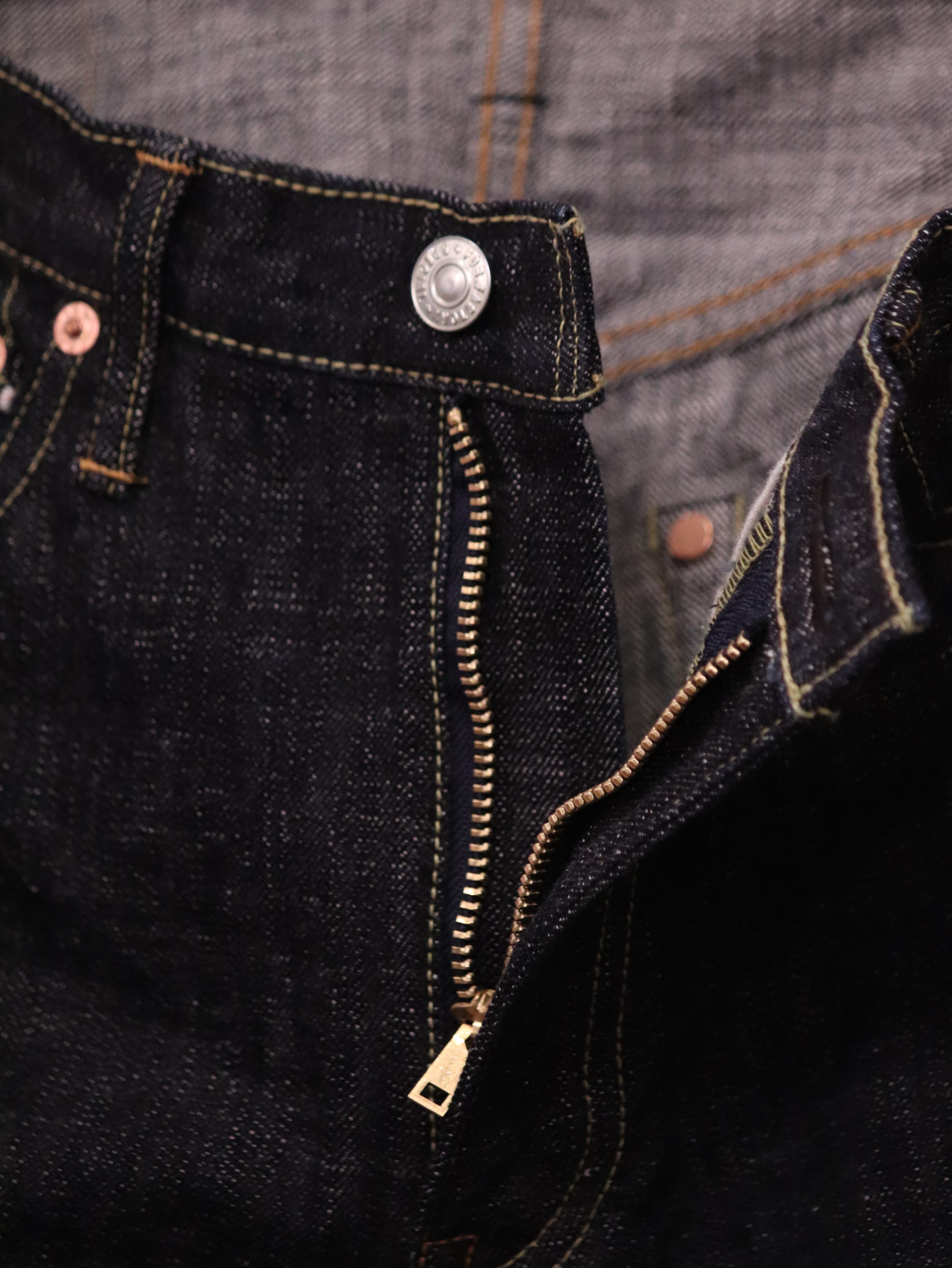 また、ヴィンテージ感あふれる両爪引手のUNIVERSAL FASTERを使用しており、開閉のしやすいジッパーフライの仕様になっています。