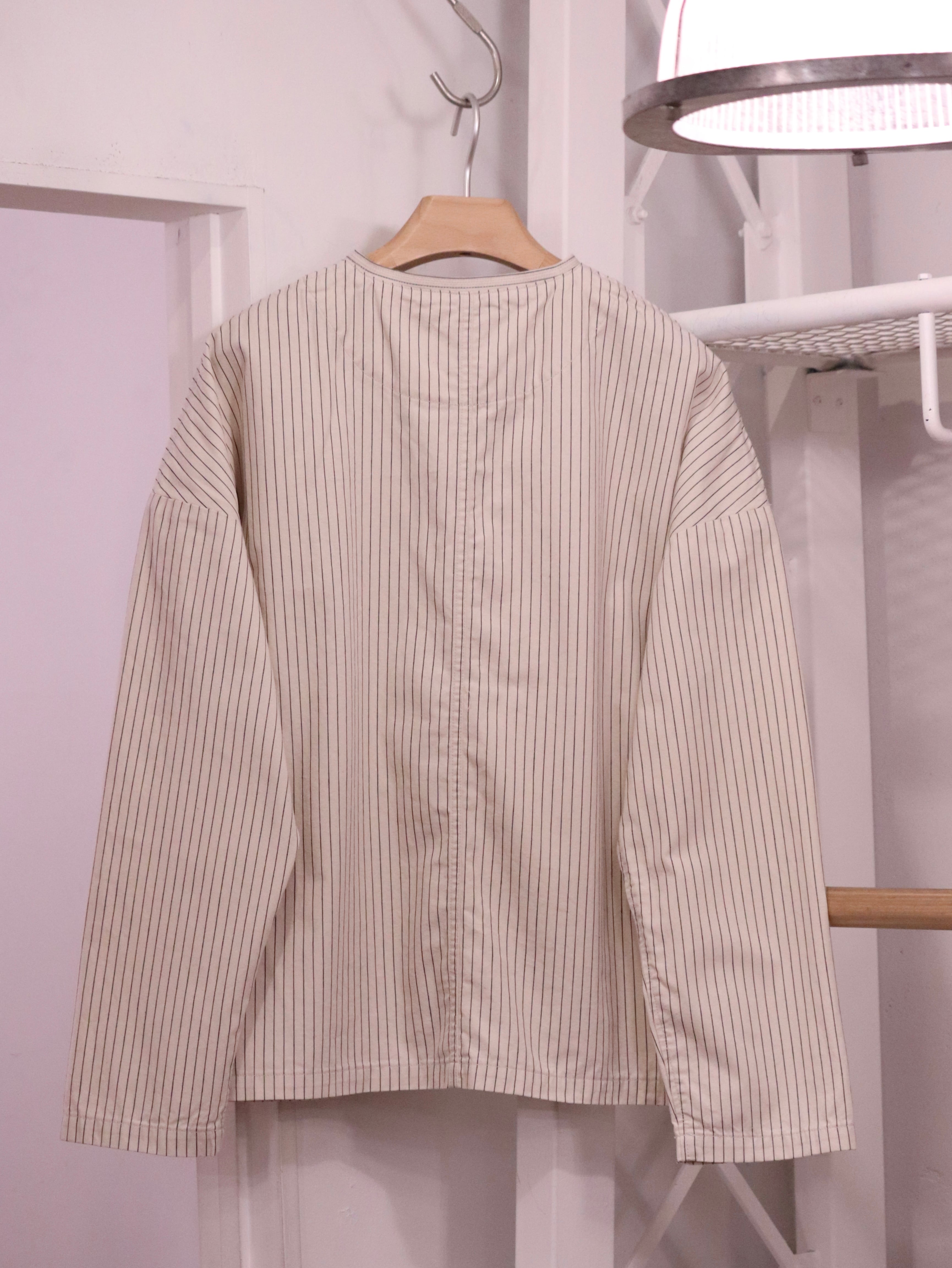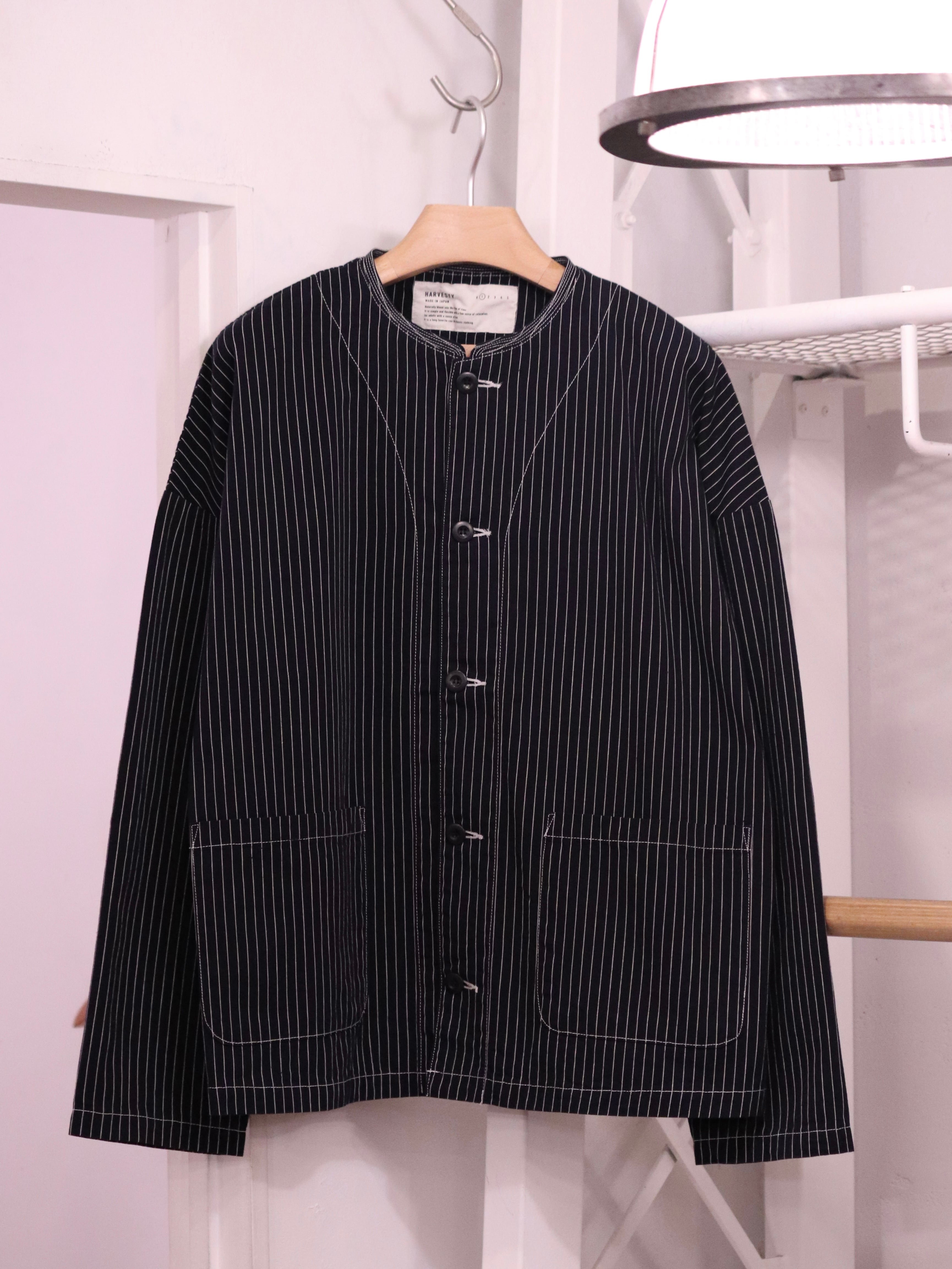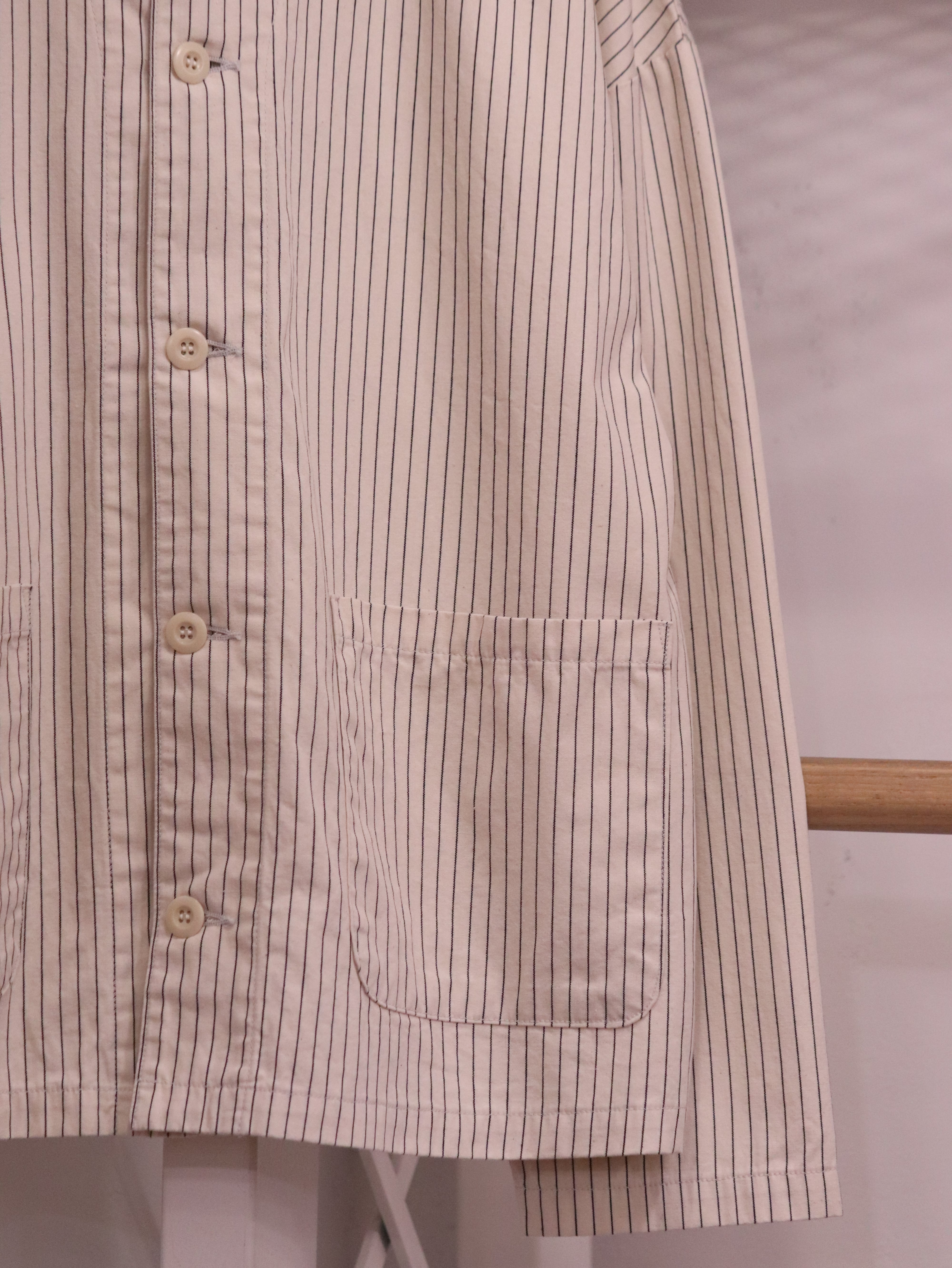 小さなスタンドカラーが特徴の肩の落ちたゆったりめシルエットのアトリエジャケットに、ペンシルストライプ生地が新入荷しました。