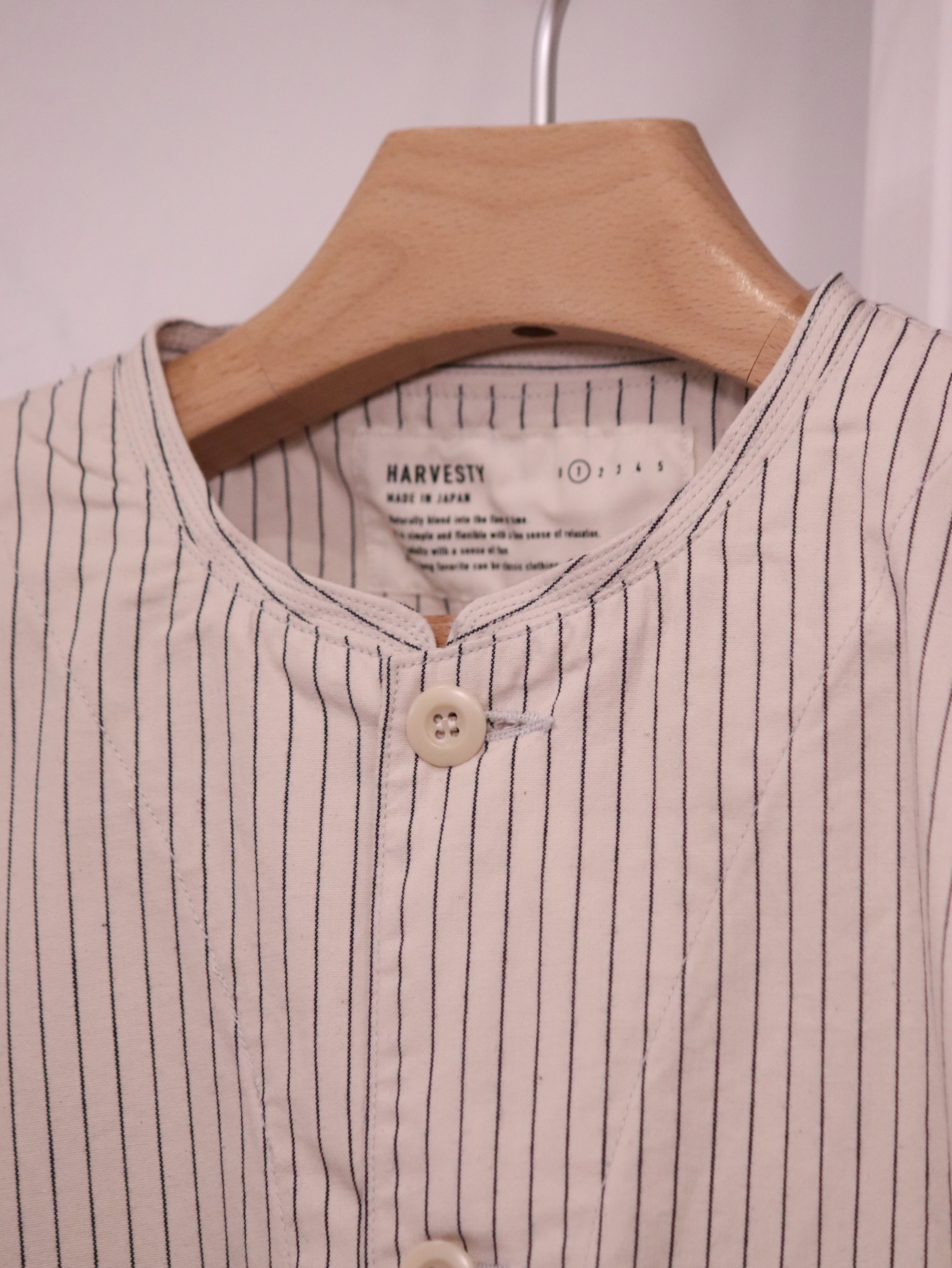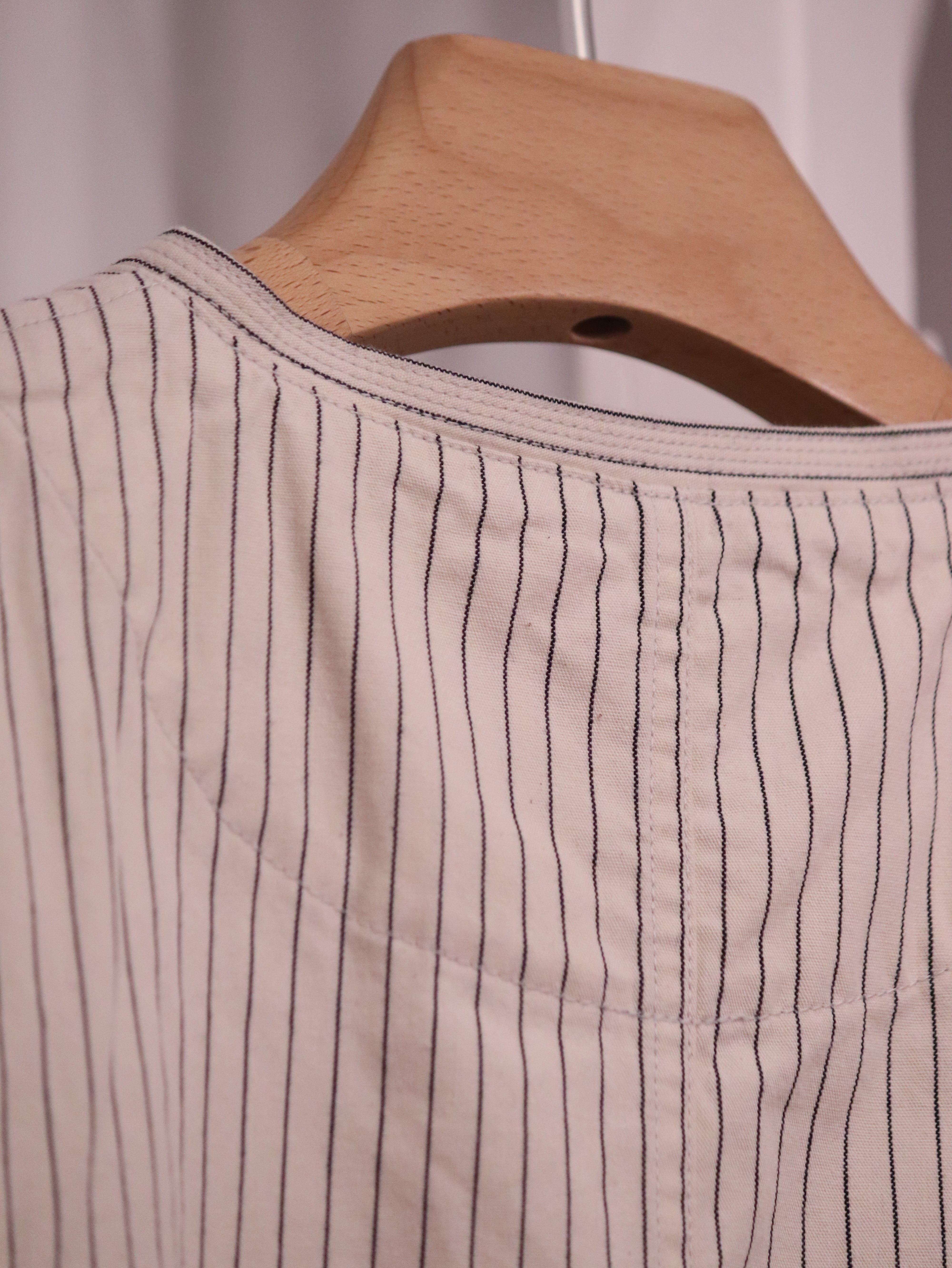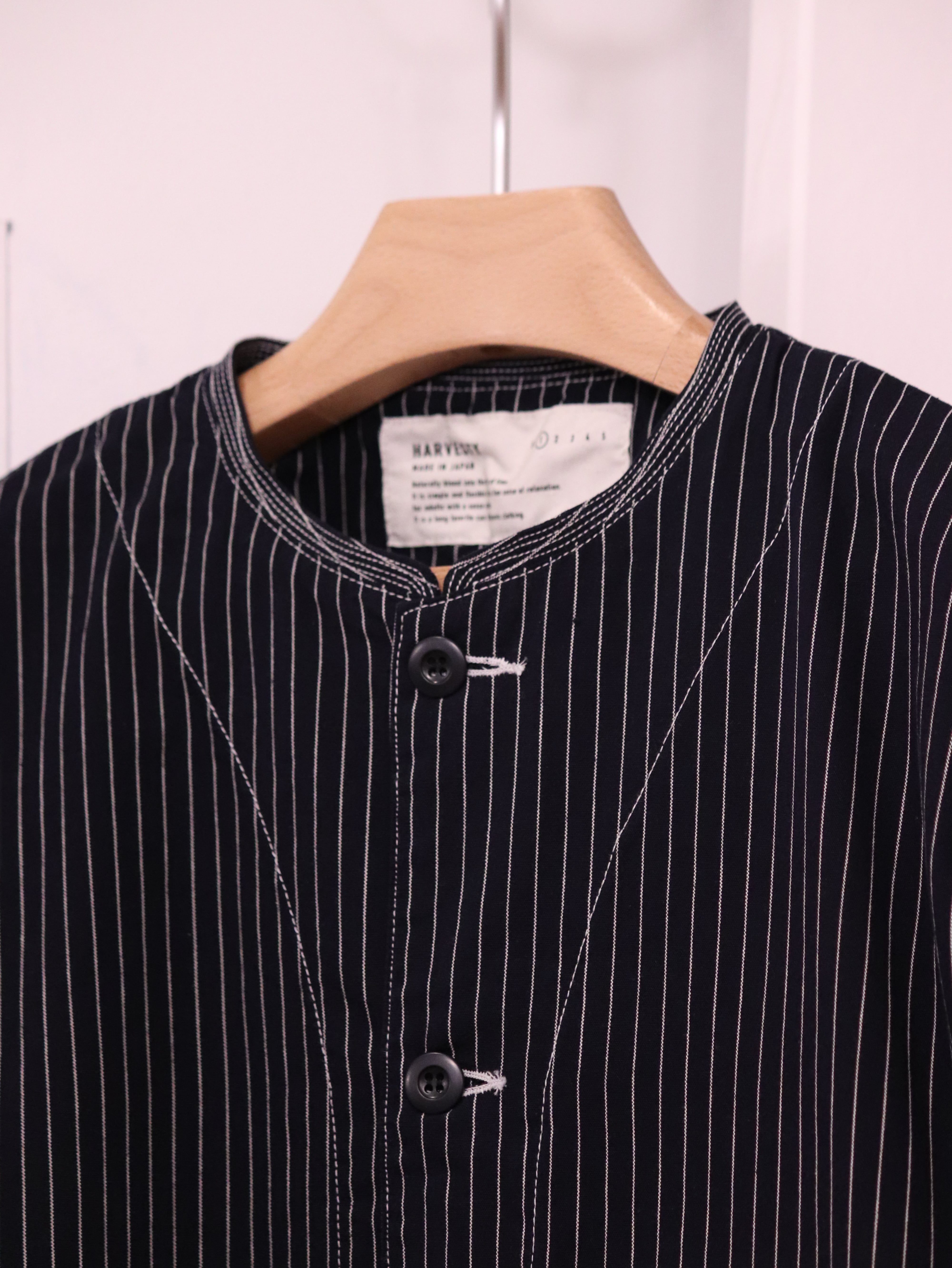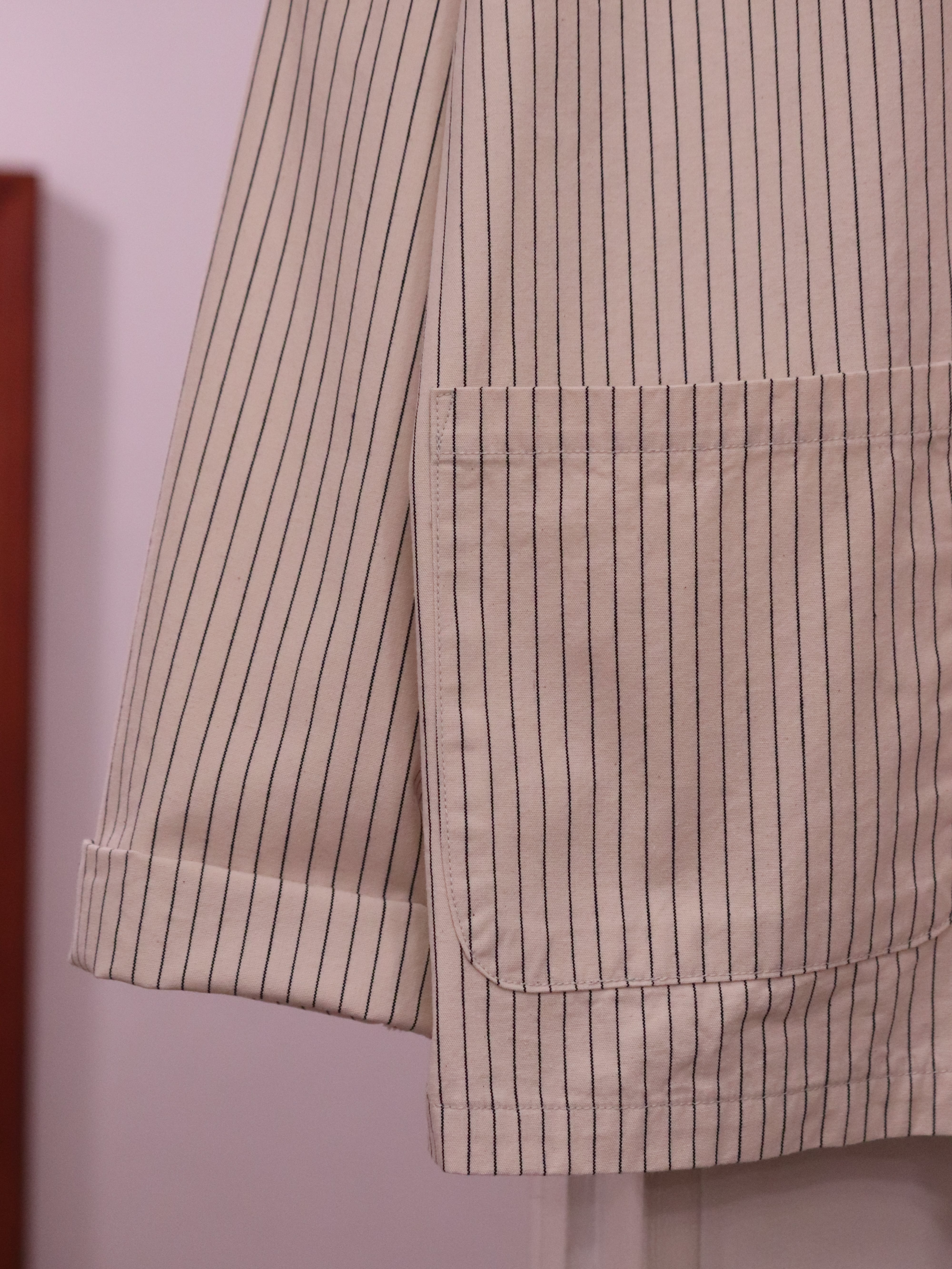 小さなスタンドカラーが特徴の肩の落ちたゆったりめシルエットのアトリエジャケットに、ペンシルストライプ生地が新入荷しました。