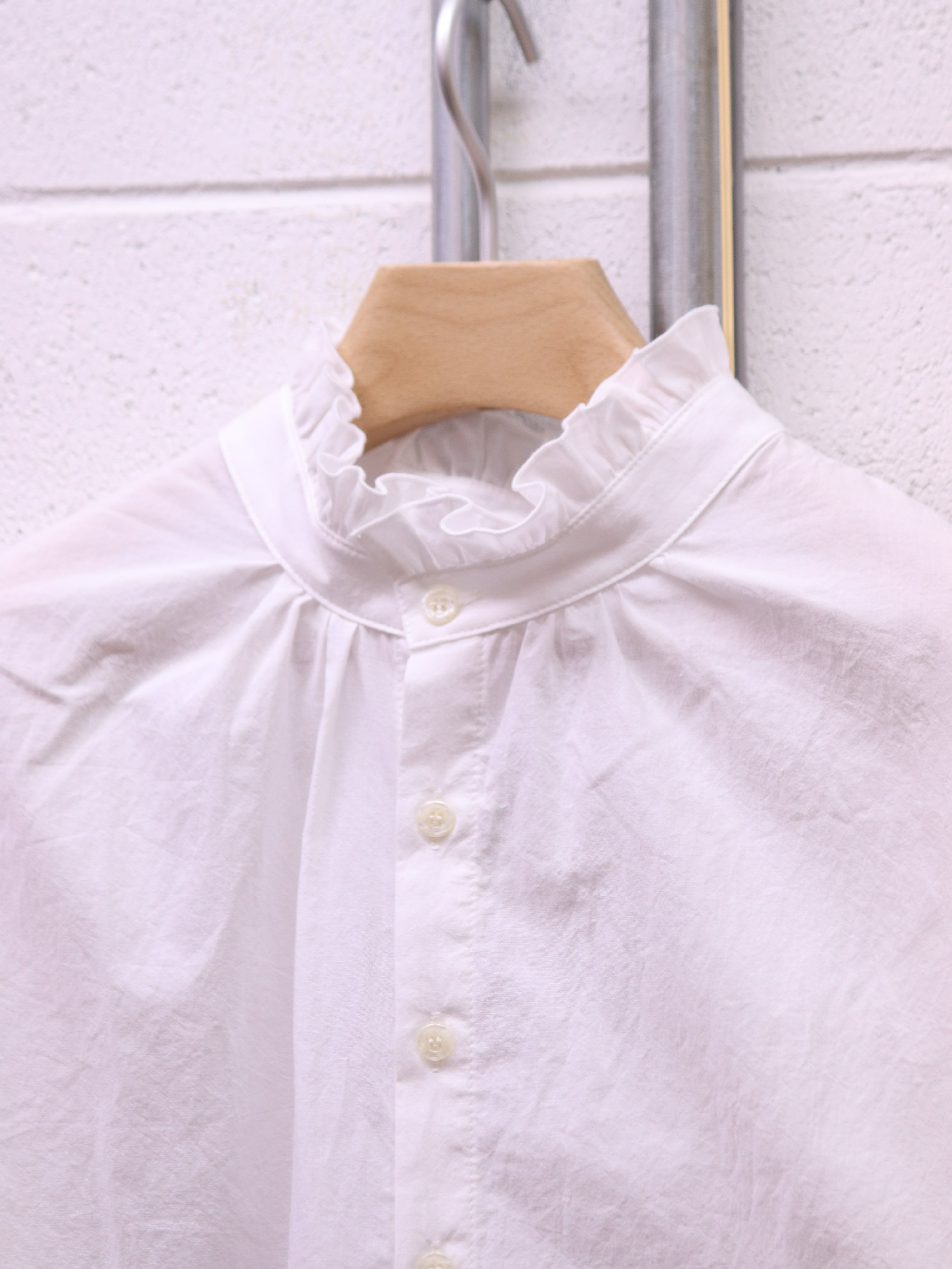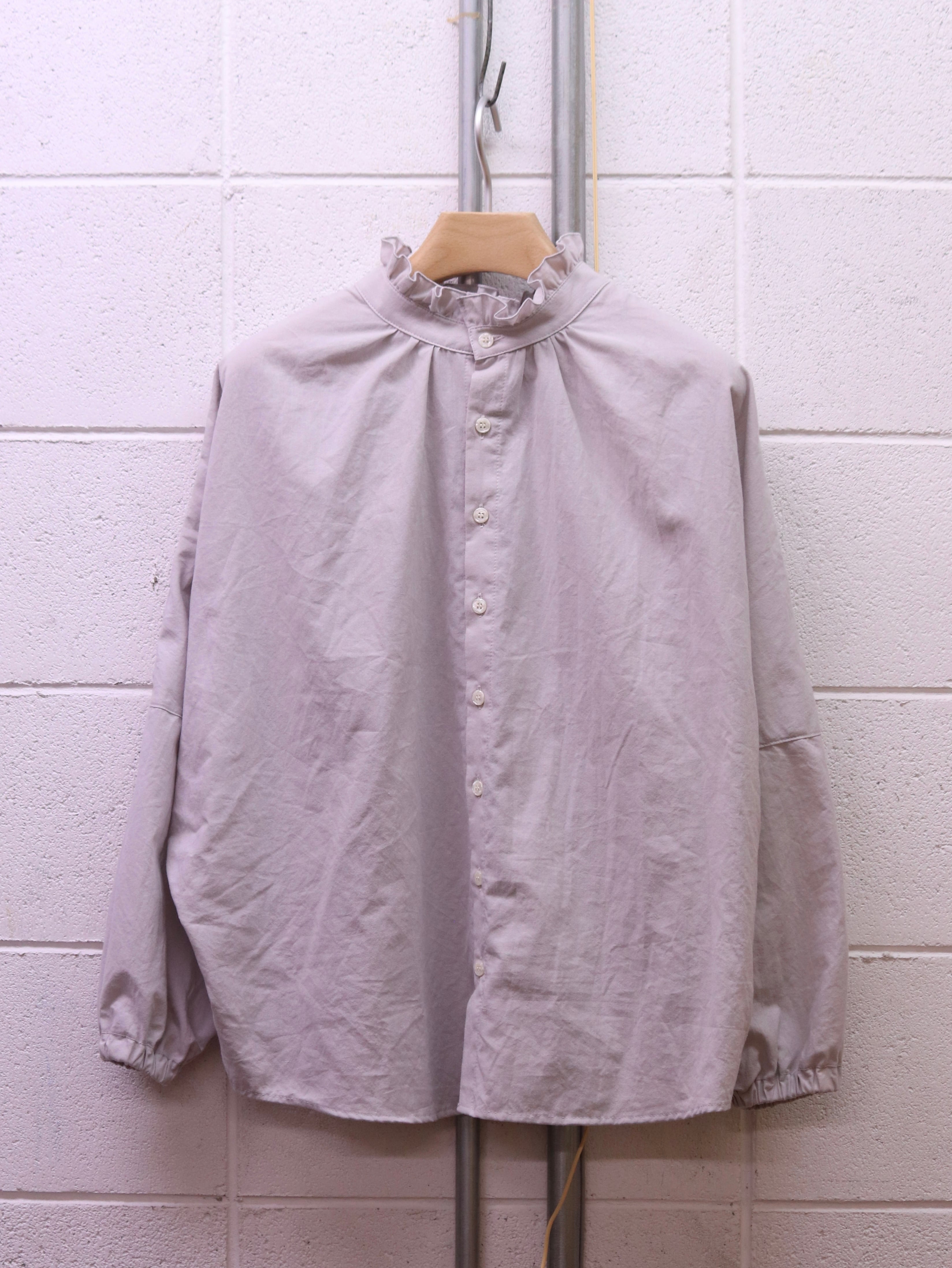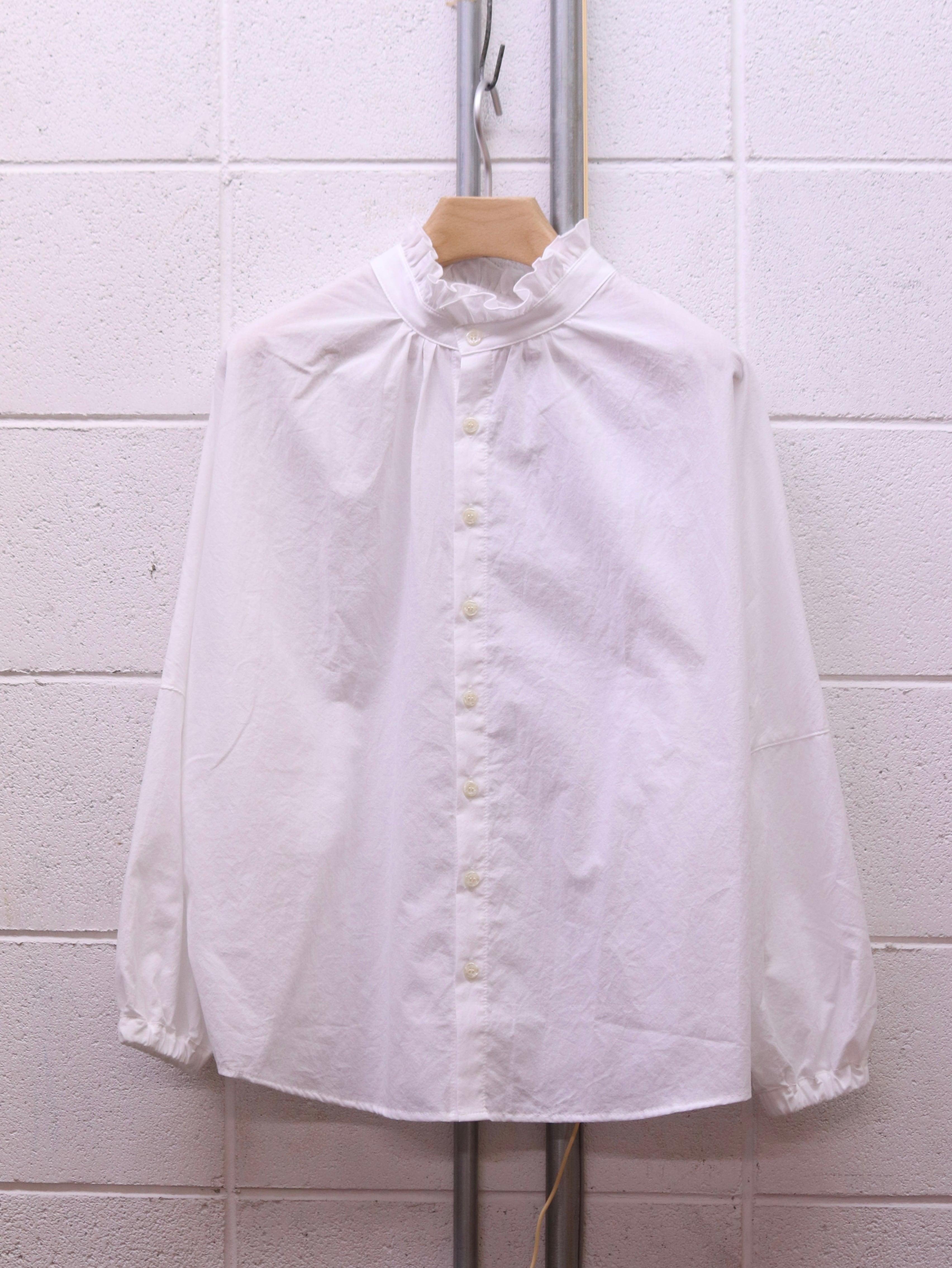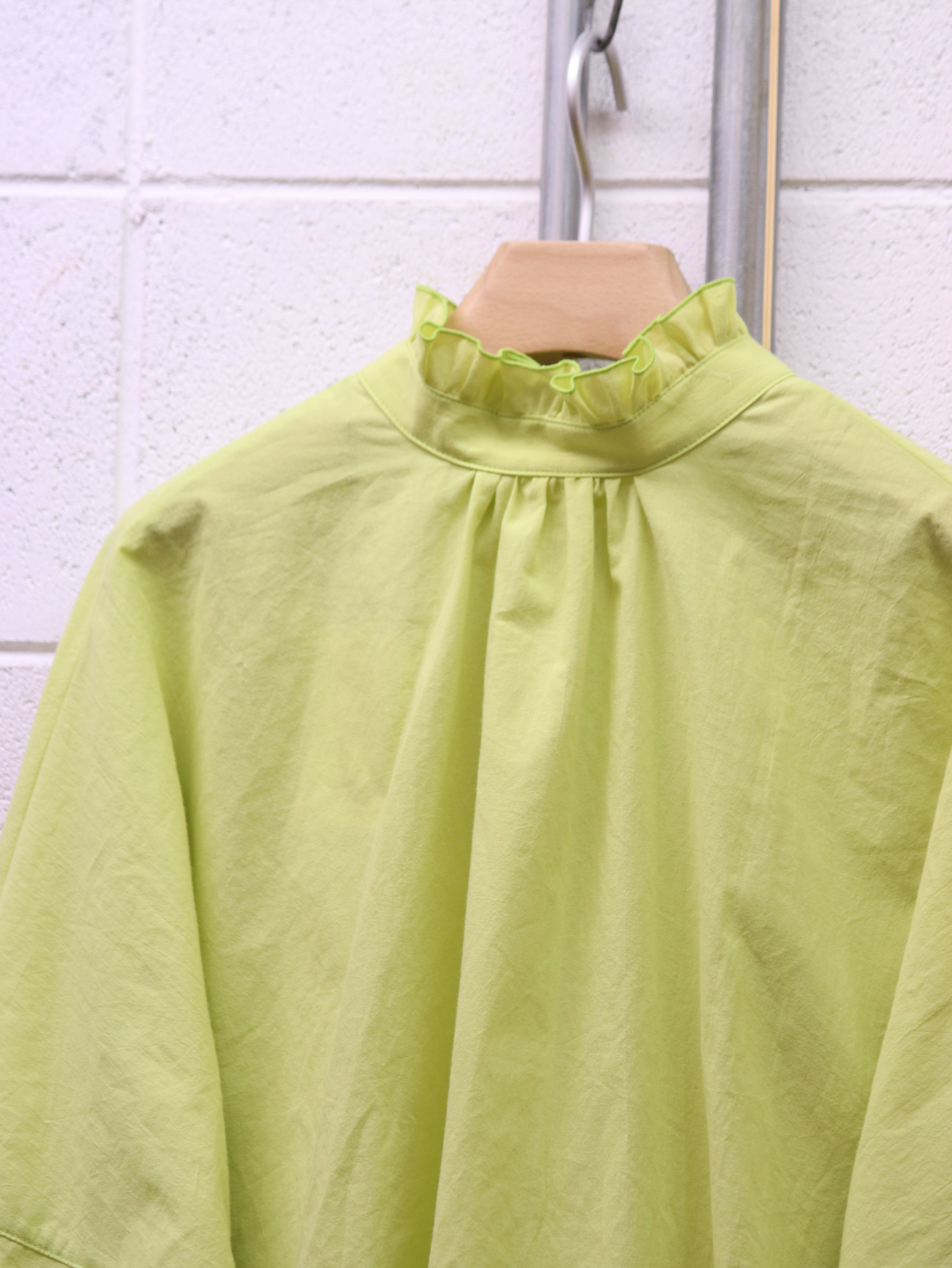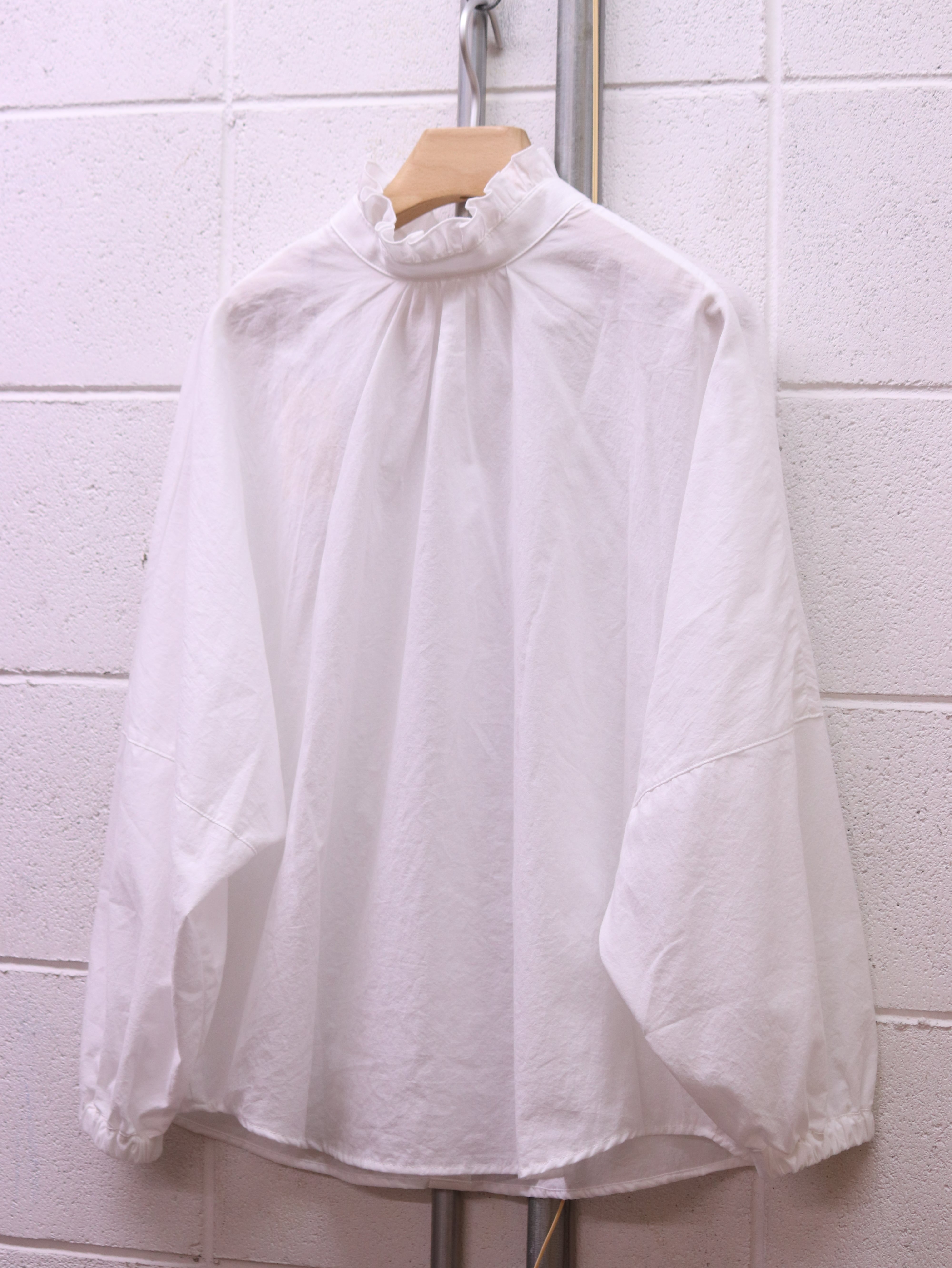 ふんわりと広がるスリーブと、さりげないフリルカラー。クラシカルなムードを漂わせながらも、日常にそっと寄り添う、ブランド定番のふんわりローンチハヤシャツです。前後どちらを前にしても着られる2WAY仕様なので、その日の気分で表情を変えられるのも魅力です。