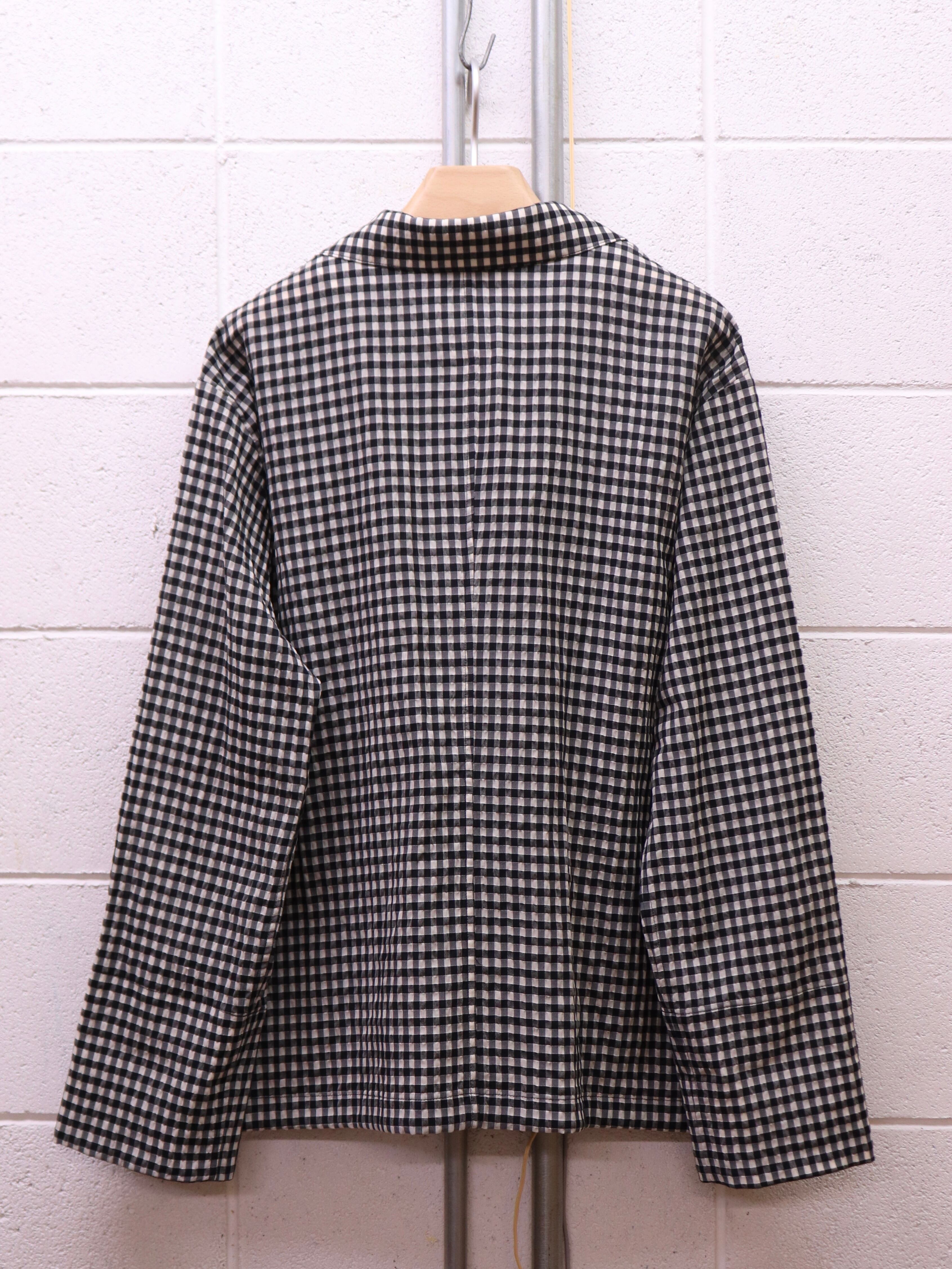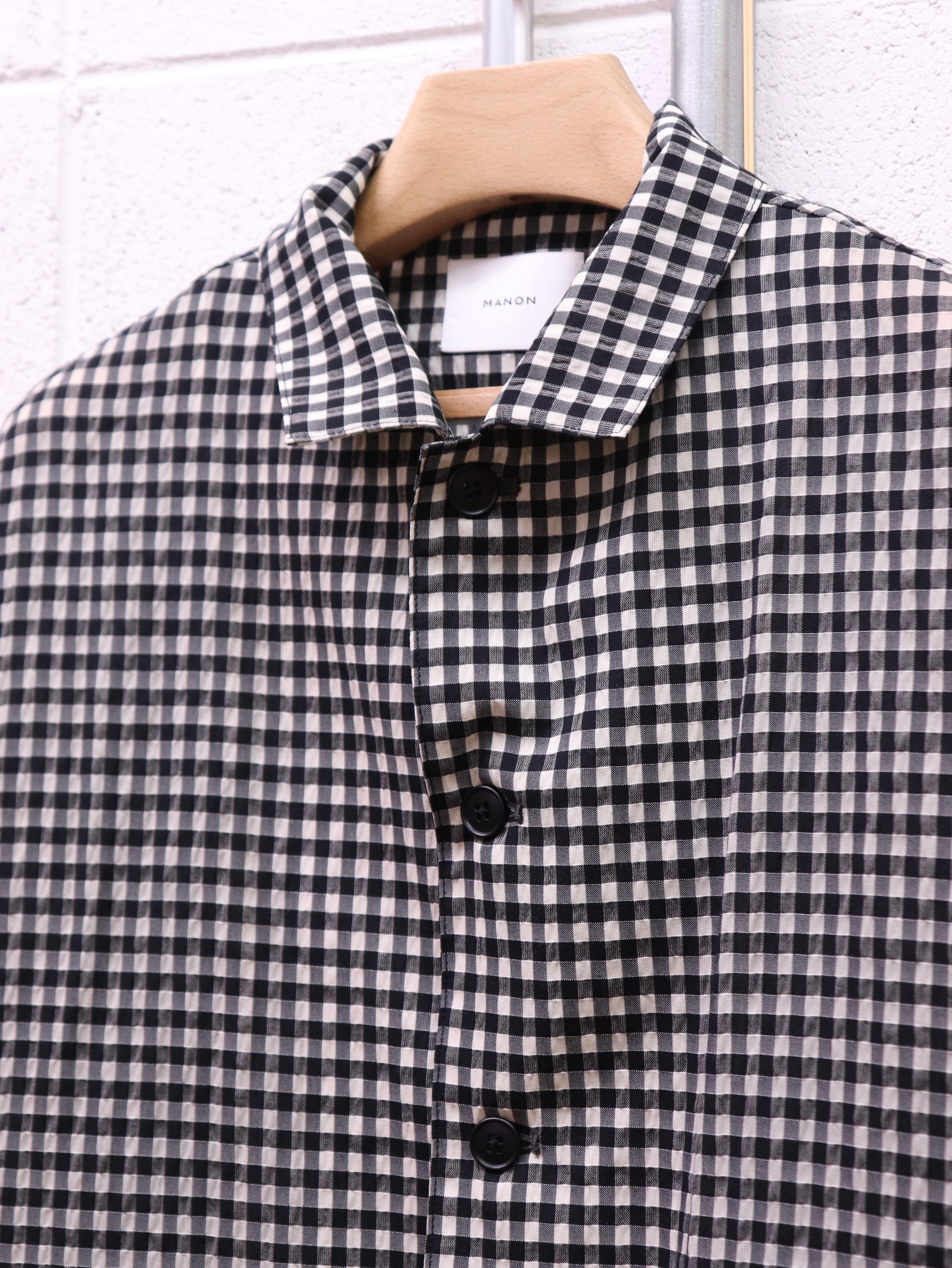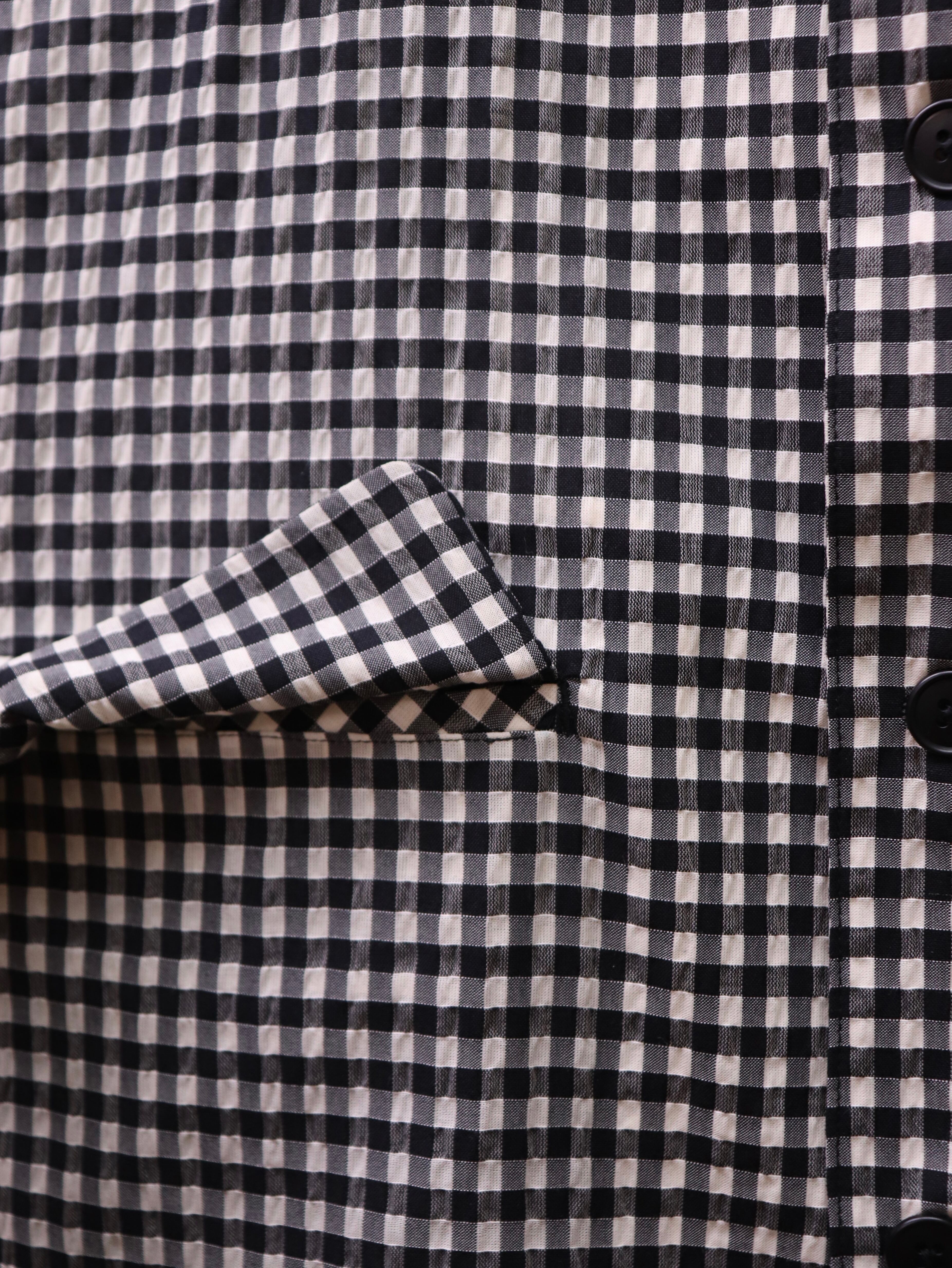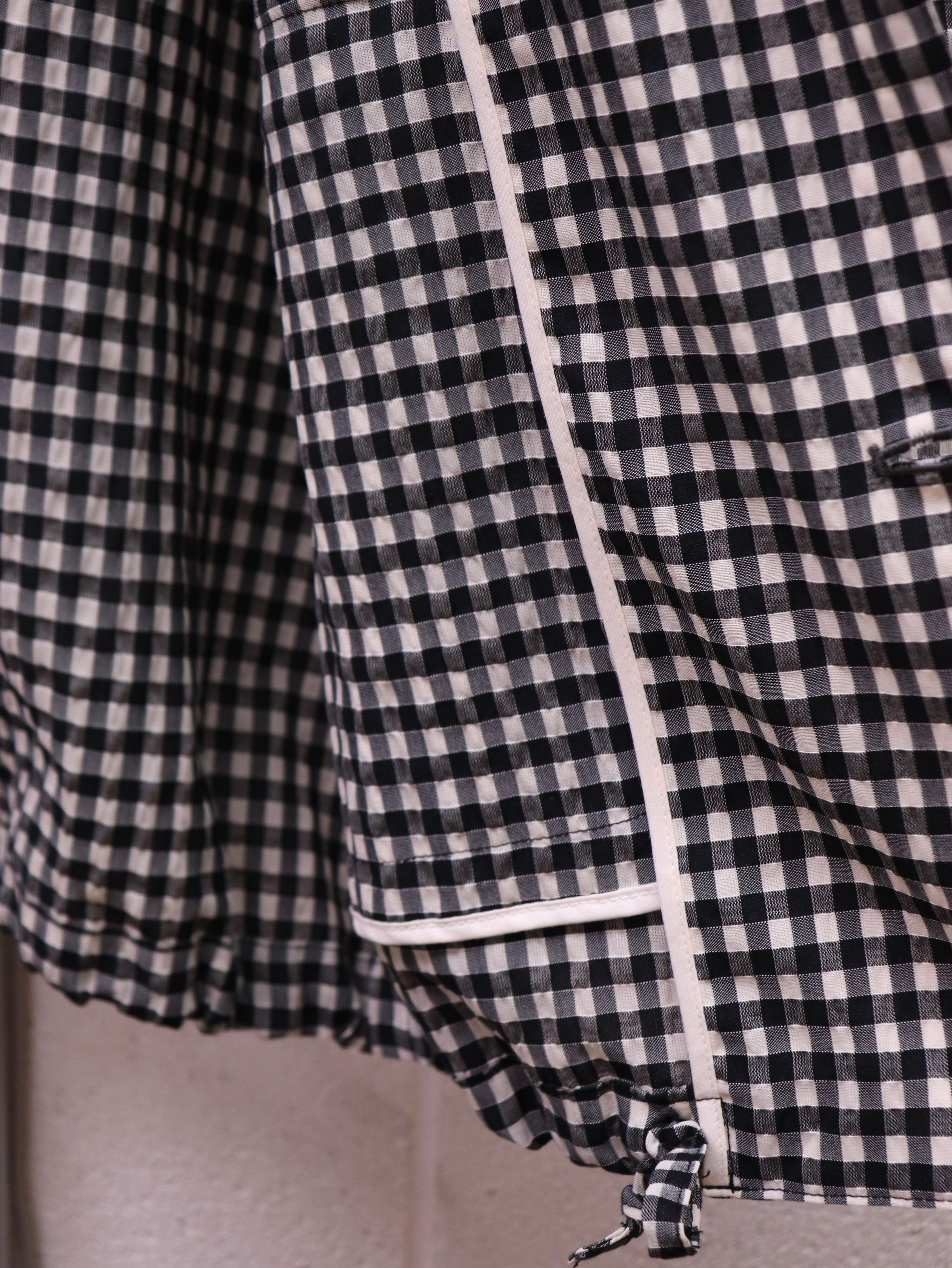 ギンガムチェック柄の軽やかな素材を使用した、柔らかく通気性と動きやすさを重視したコーチジャケットです。シワになりにくく春夏の装いに最適で、快適さと上品さを兼ね備えています。