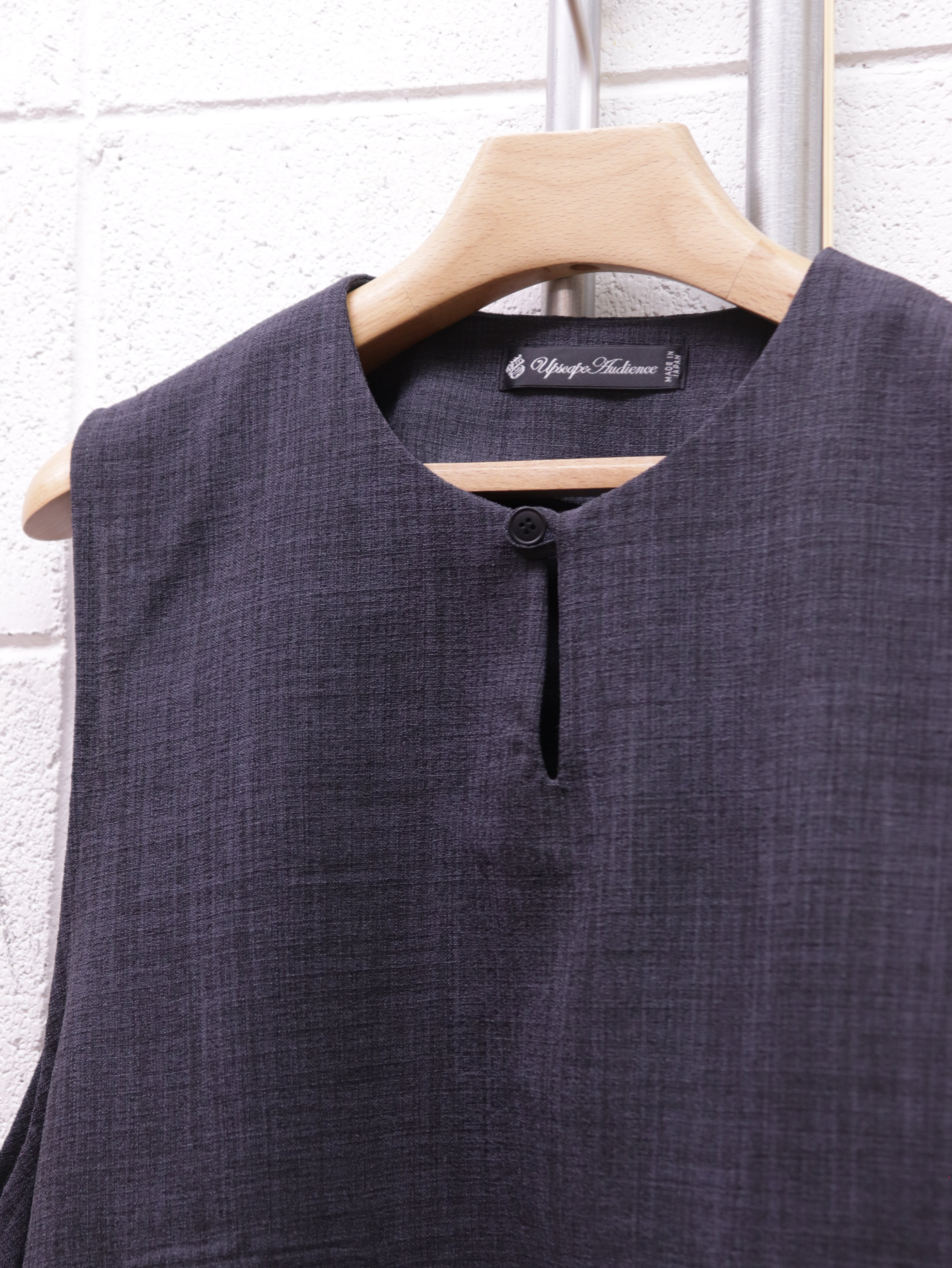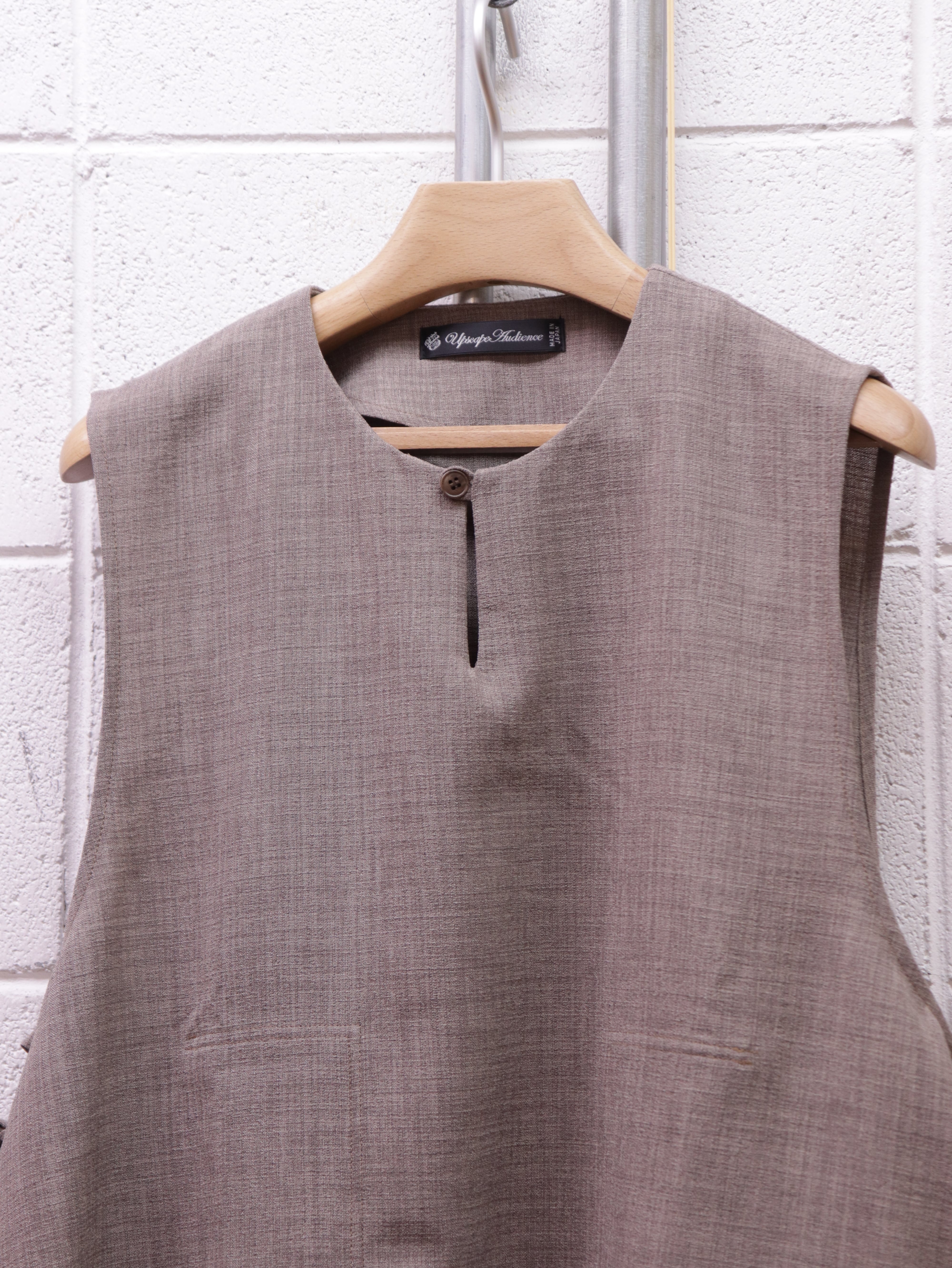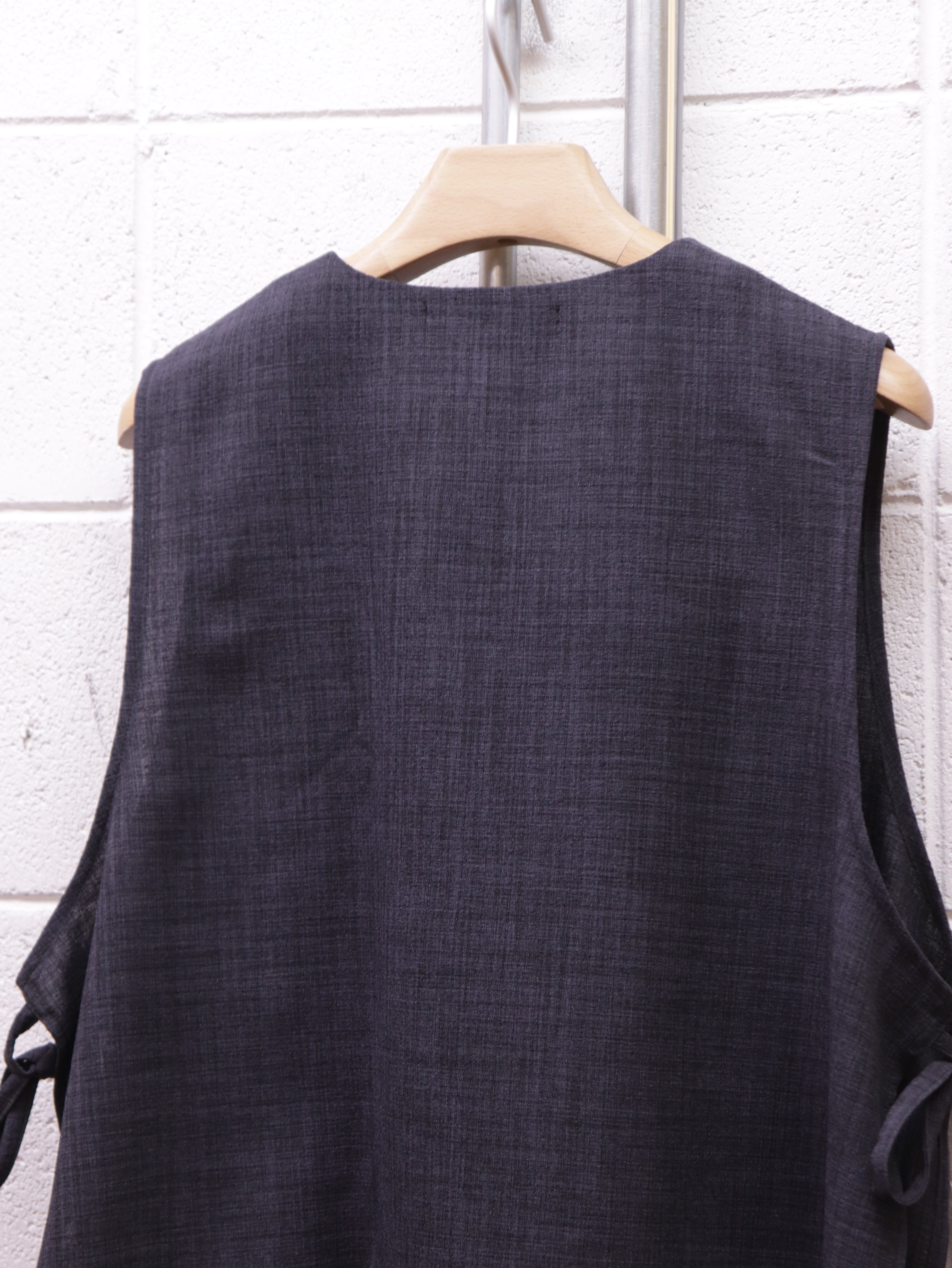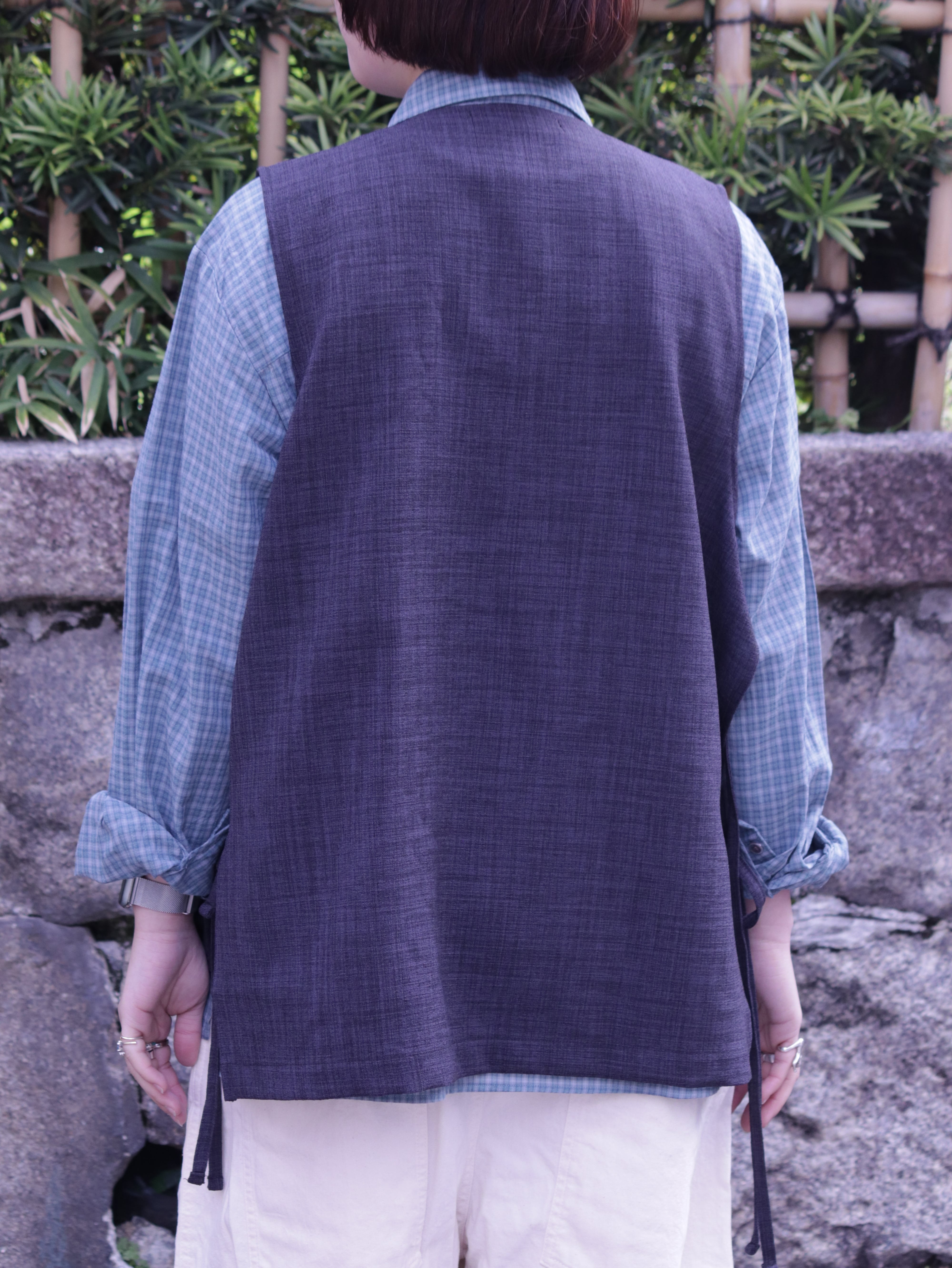 前面裏には大きめな二つのパッチポケットがつき、一見シンプルながら個性的な仕様が詰まった一着です。シャツやカットソー、薄手のニットなどの上にも合わせやすく、あたたかい春夏シーズンにもレイヤードがしやすい仕様です。
