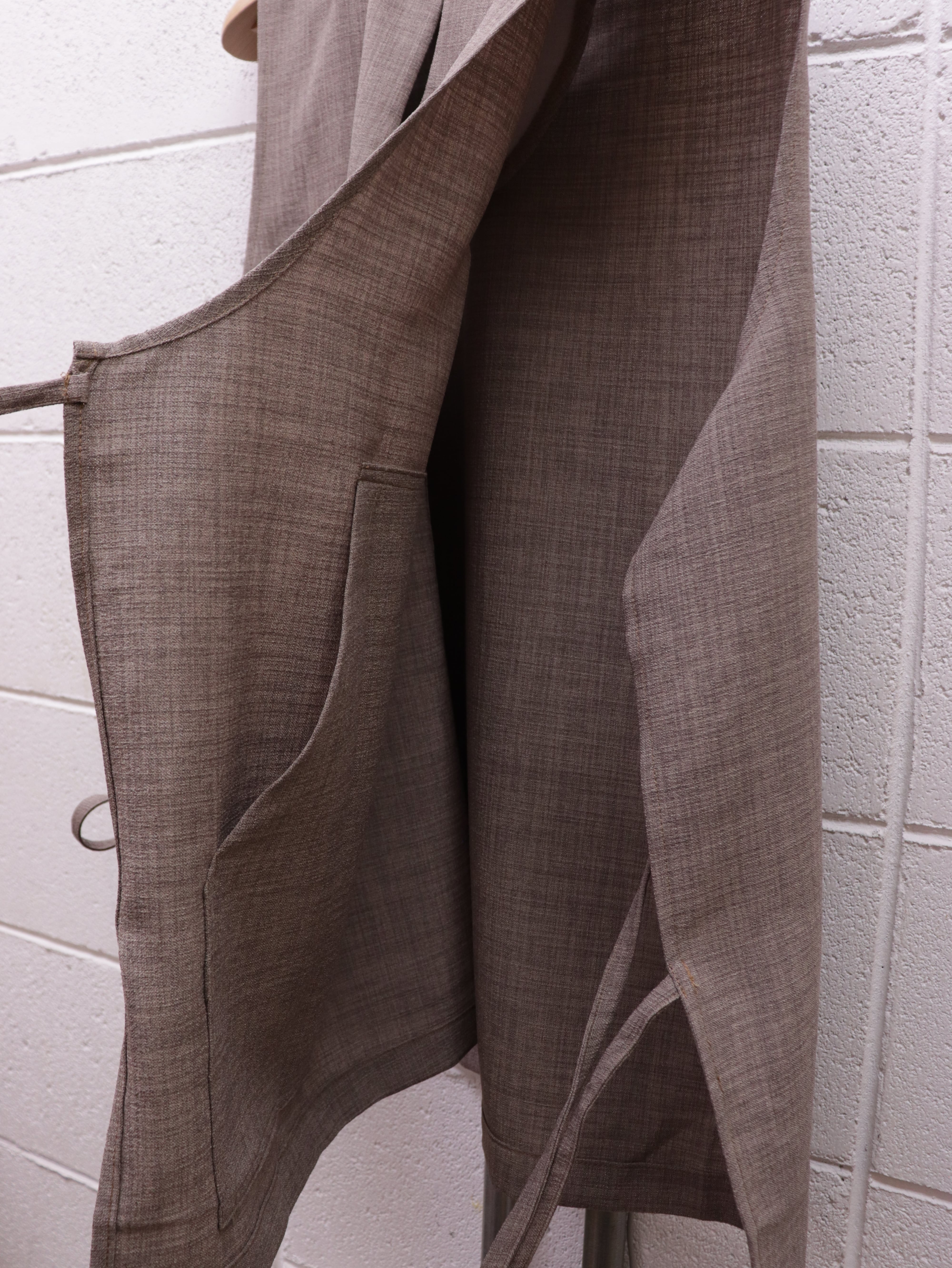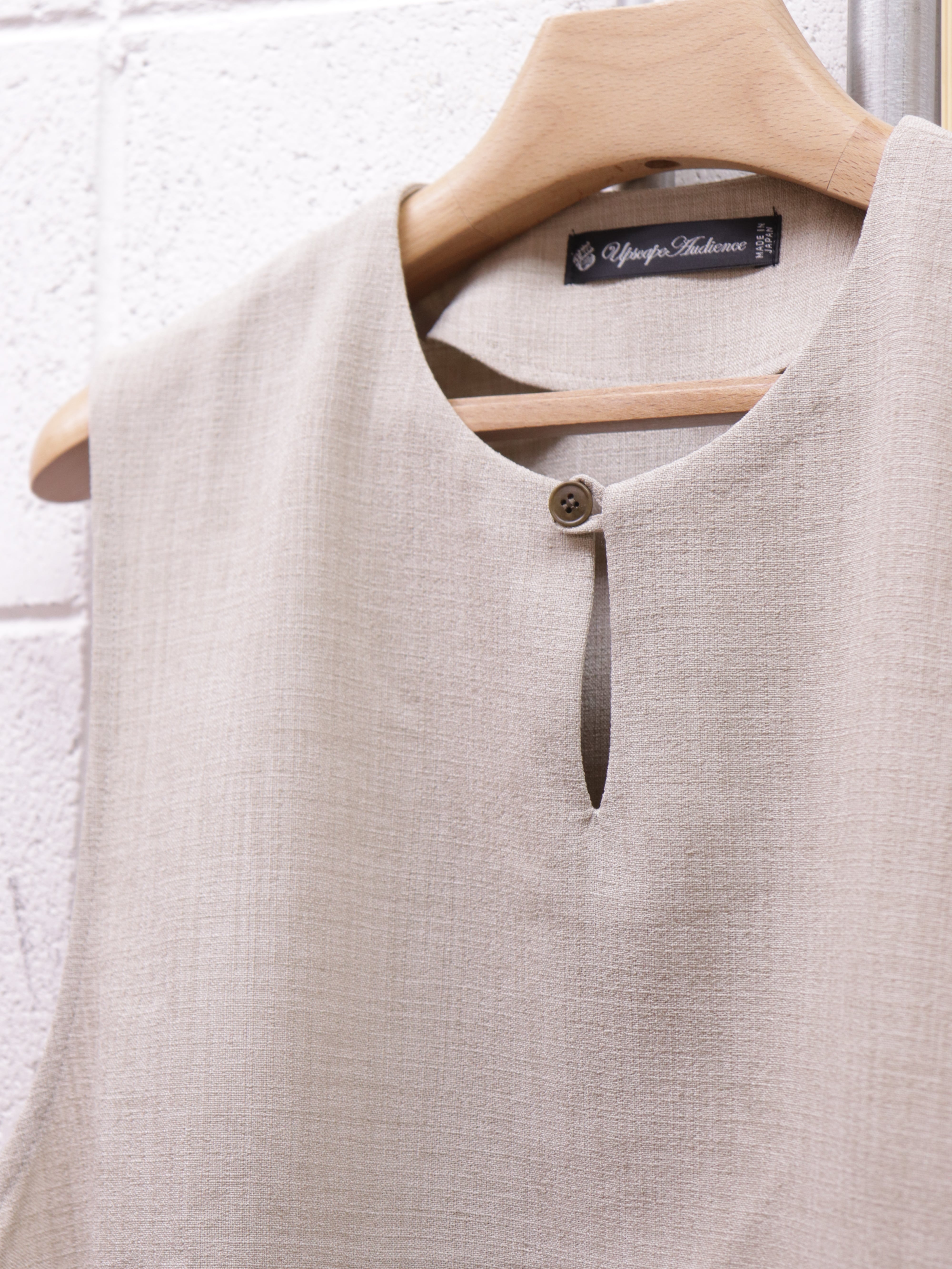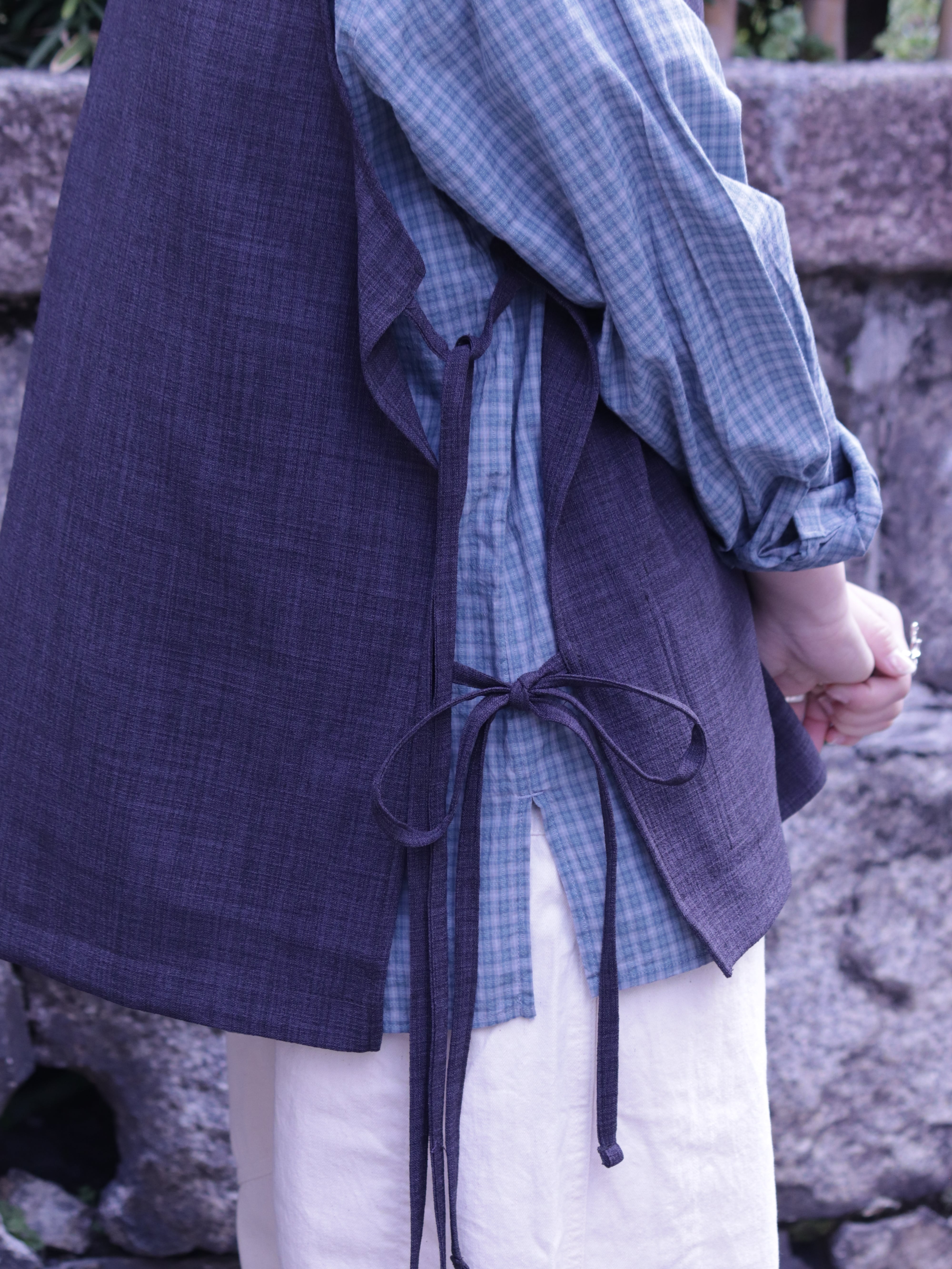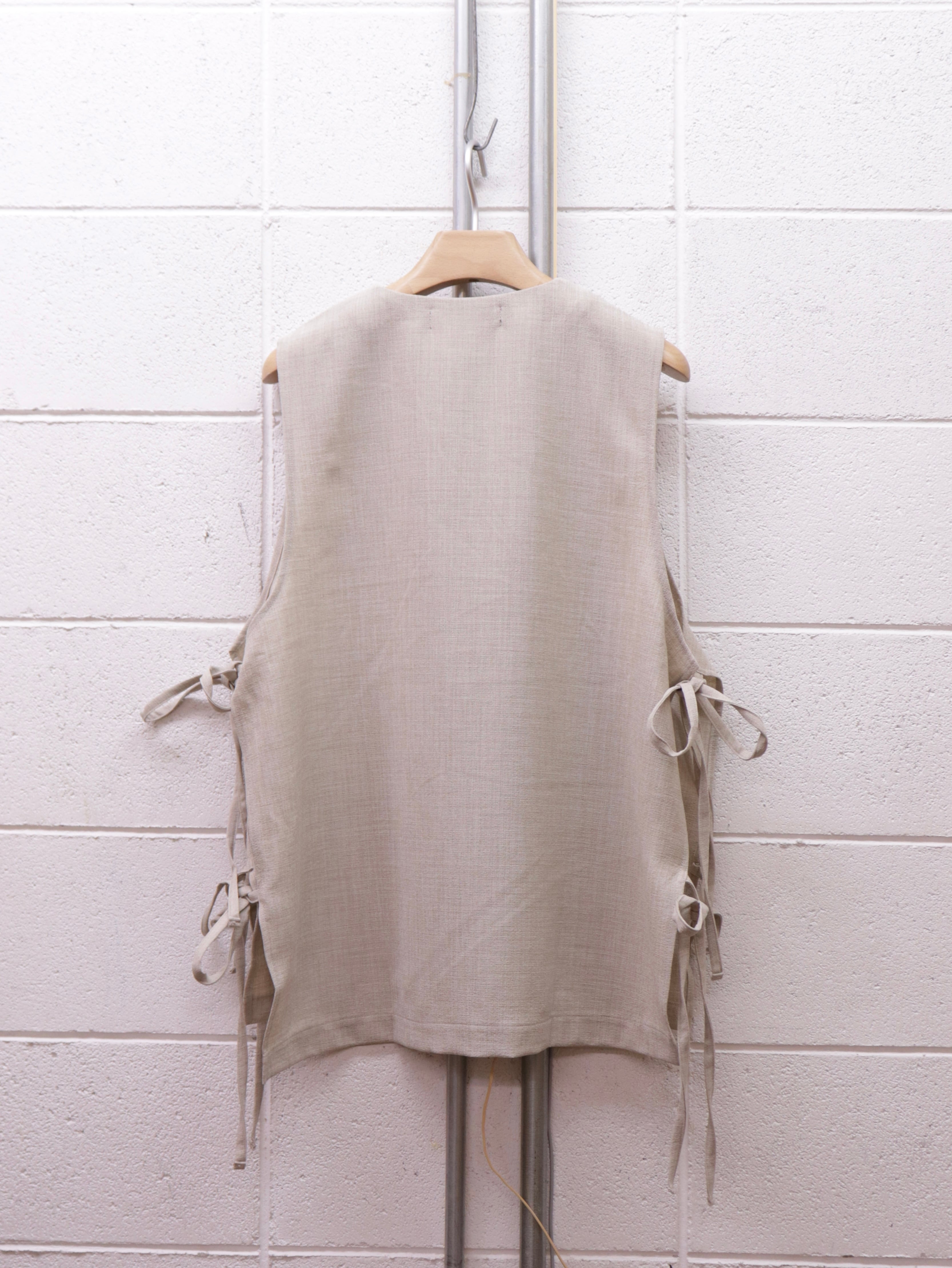 前面裏には大きめな二つのパッチポケットがつき、一見シンプルながら個性的な仕様が詰まった一着です。シャツやカットソー、薄手のニットなどの上にも合わせやすく、あたたかい春夏シーズンにもレイヤードがしやすい仕様です。